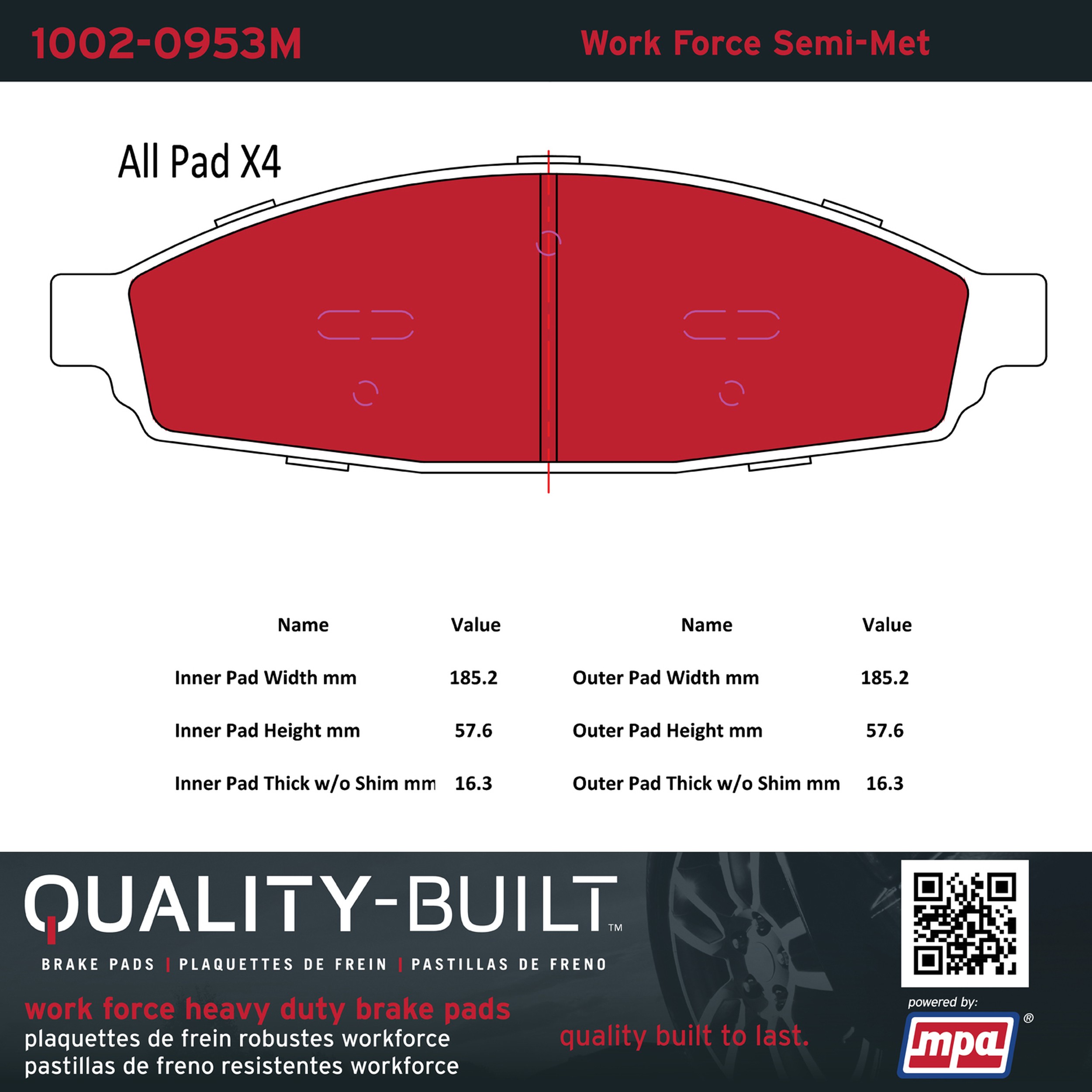 - Hardworking vehicles need hardworking brake pads, and Quality-Built Work force brake pads deliver every time. Specially formulated friction compounds are designed for high heat, heavy-duty use, where repeat stop situations, off-road driving, or towing push brake pads to the limits. Work force brake pads are an excellent choice for fleet use where extended service life and maximum durability are required.