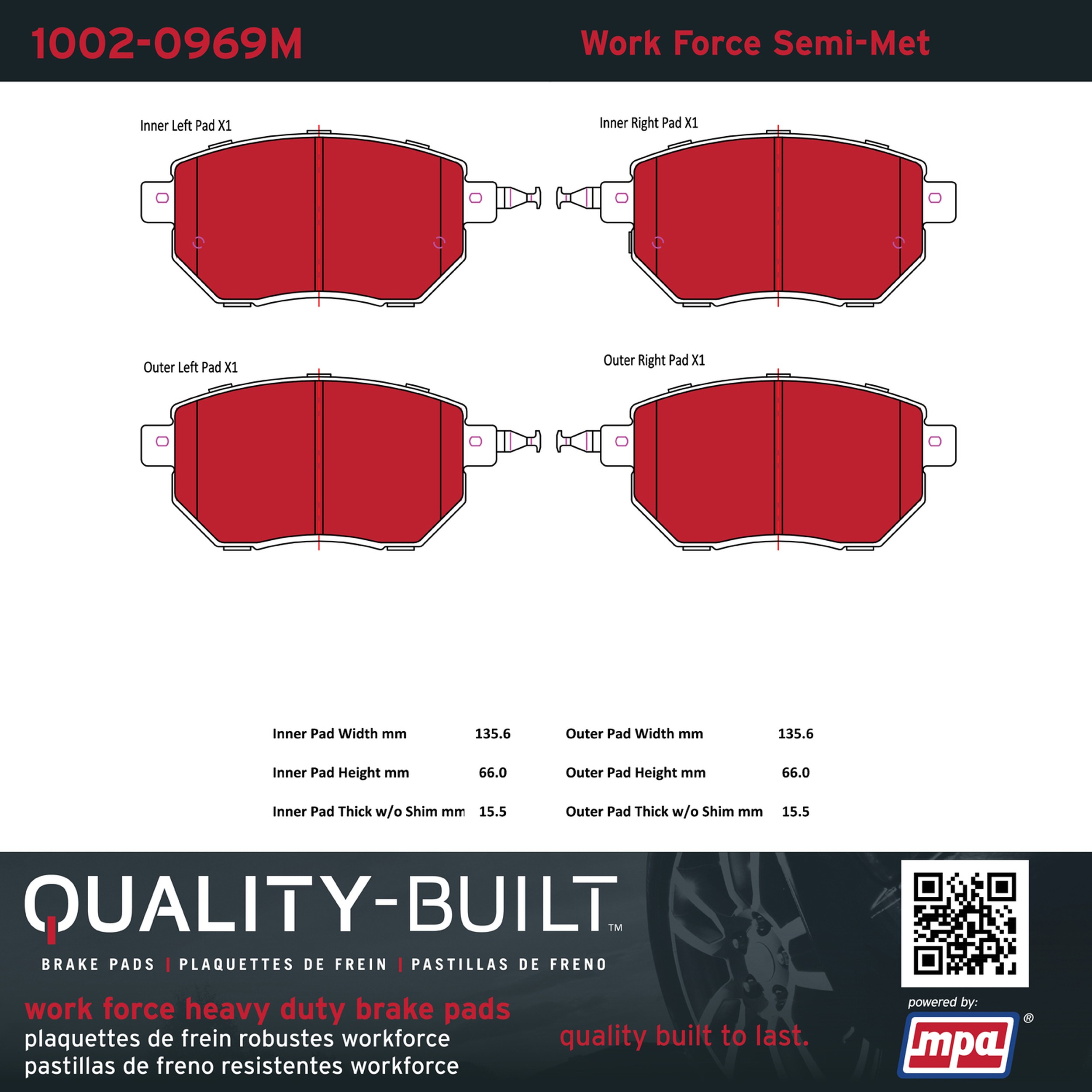 - Hardworking vehicles need hardworking brake pads, and Quality-Built Work force brake pads deliver every time. Specially formulated friction compounds are designed for high heat, heavy-duty use, where repeat stop situations, off-road driving, or towing push brake pads to the limits. Work force brake pads are an excellent choice for fleet use where extended service life and maximum durability are required.