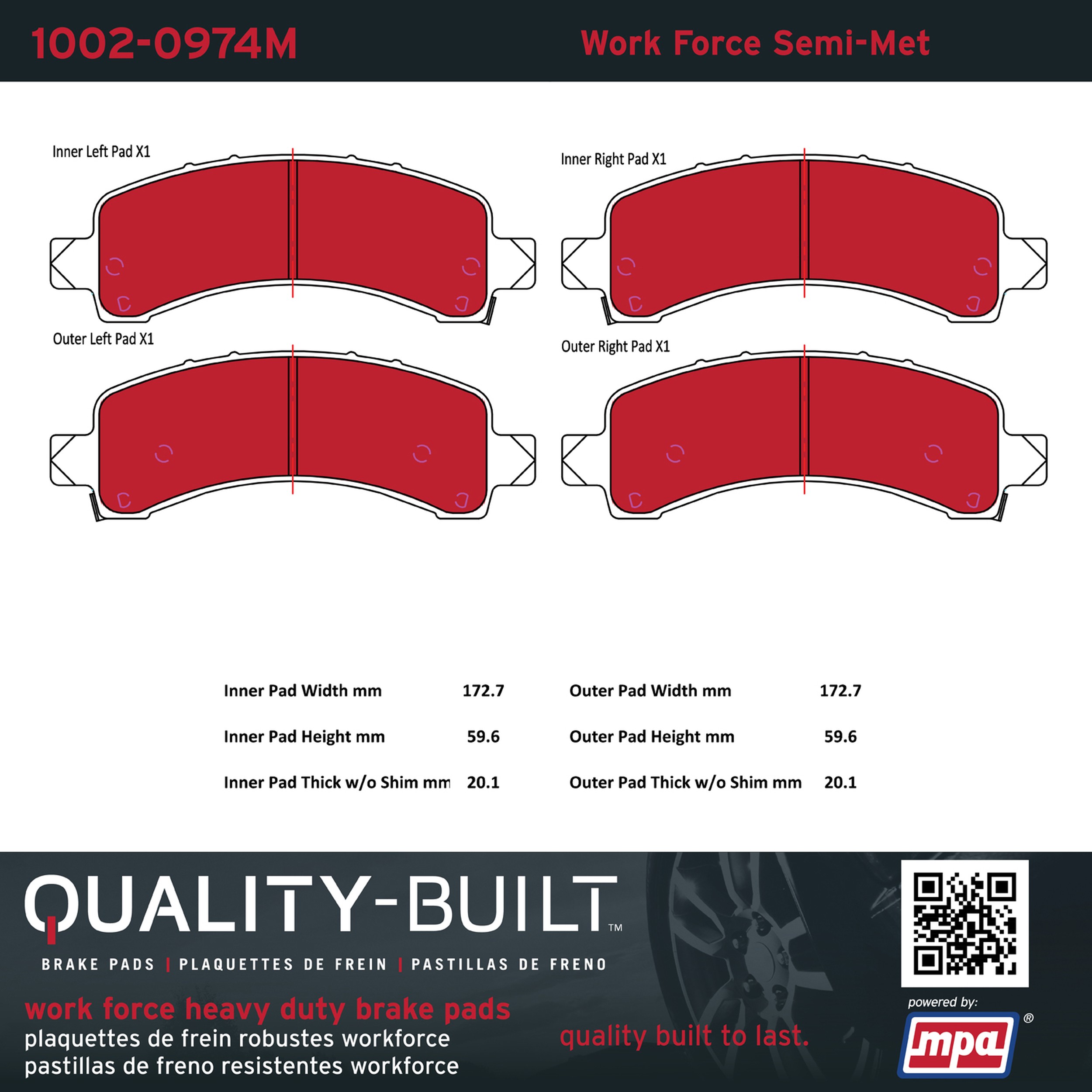 - Hardworking vehicles need hardworking brake pads, and Quality-Built Work force brake pads deliver every time. Specially formulated friction compounds are designed for high heat, heavy-duty use, where repeat stop situations, off-road driving, or towing push brake pads to the limits. Work force brake pads are an excellent choice for fleet use where extended service life and maximum durability are required.