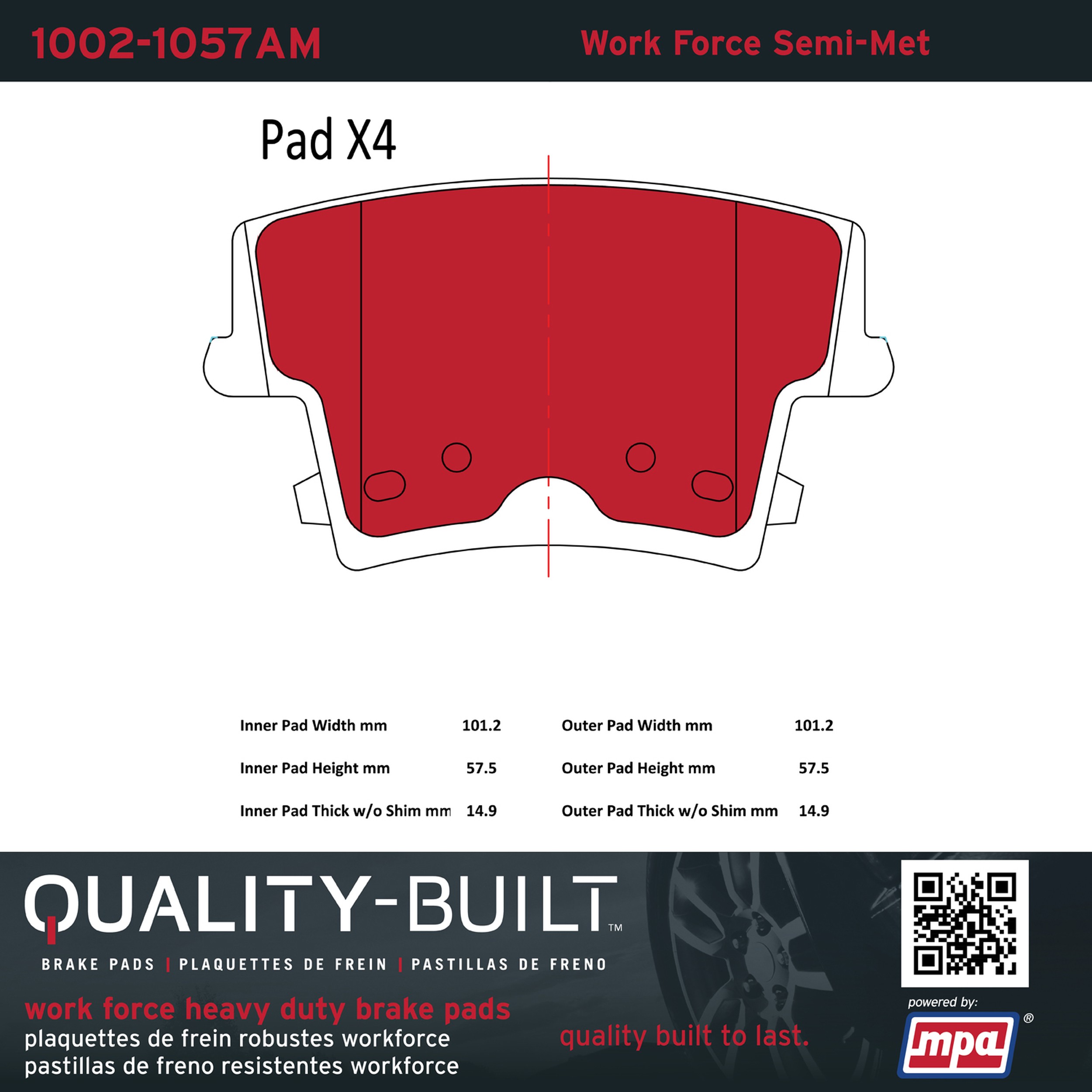 - Hardworking vehicles need hardworking brake pads, and Quality-Built Work force brake pads deliver every time. Specially formulated friction compounds are designed for high heat, heavy-duty use, where repeat stop situations, off-road driving, or towing push brake pads to the limits. Work force brake pads are an excellent choice for fleet use where extended service life and maximum durability are required.