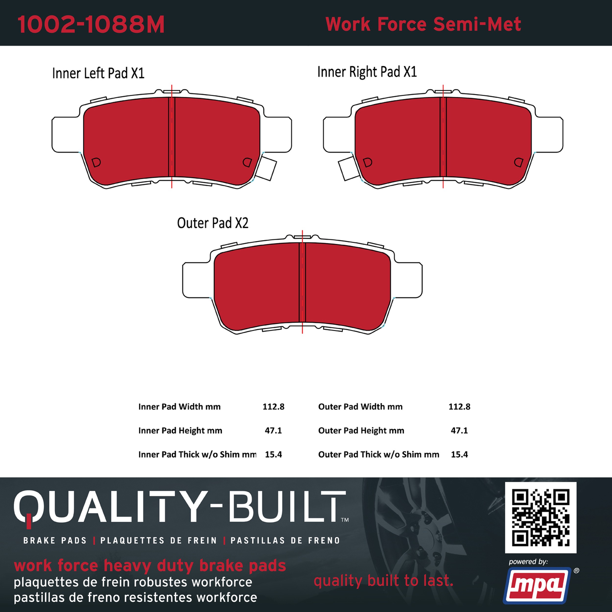- Hardworking vehicles need hardworking brake pads, and Quality-Built Work force brake pads deliver every time. Specially formulated friction compounds are designed for high heat, heavy-duty use, where repeat stop situations, off-road driving, or towing push brake pads to the limits. Work force brake pads are an excellent choice for fleet use where extended service life and maximum durability are required.