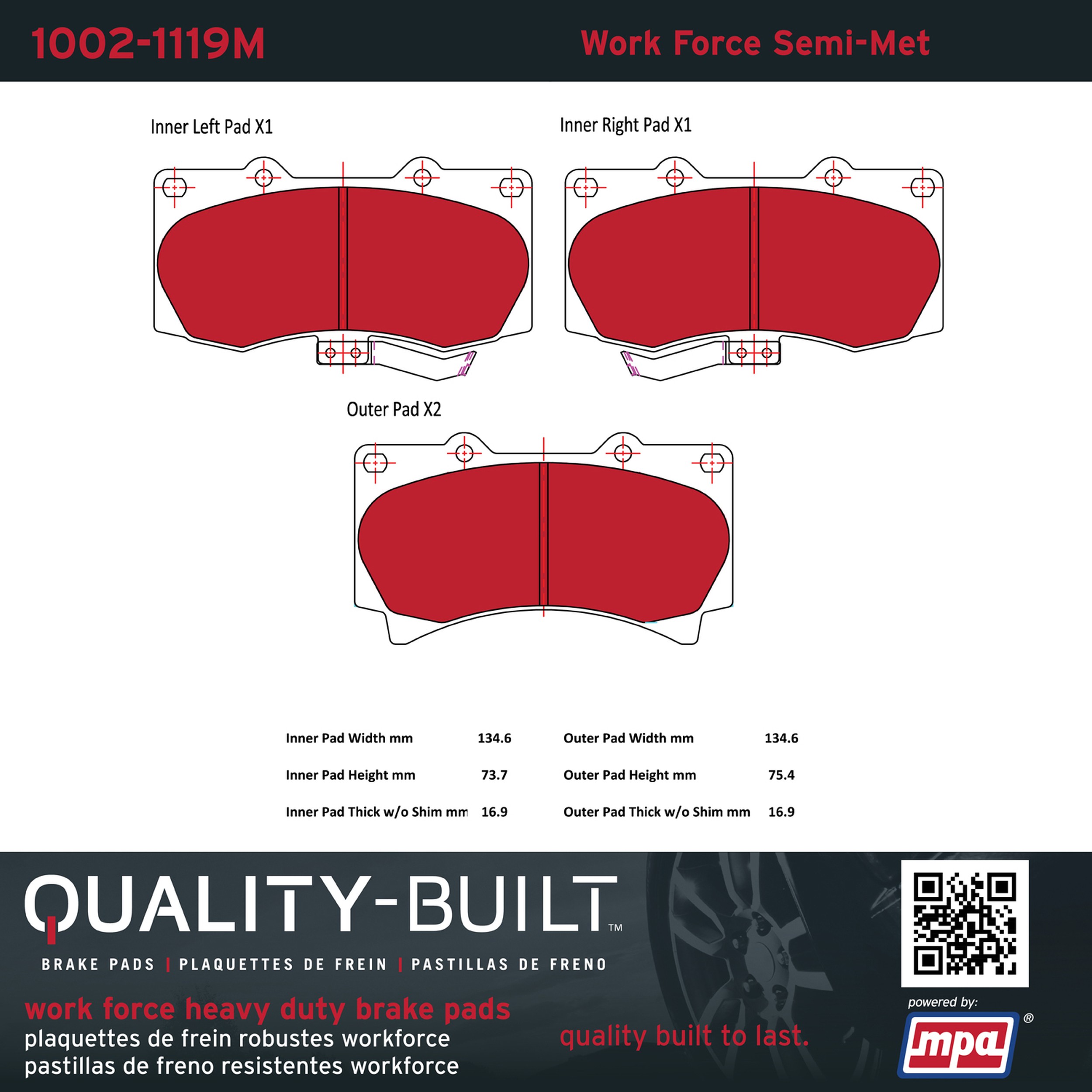 - Hardworking vehicles need hardworking brake pads, and Quality-Built Work force brake pads deliver every time. Specially formulated friction compounds are designed for high heat, heavy-duty use, where repeat stop situations, off-road driving, or towing push brake pads to the limits. Work force brake pads are an excellent choice for fleet use where extended service life and maximum durability are required.