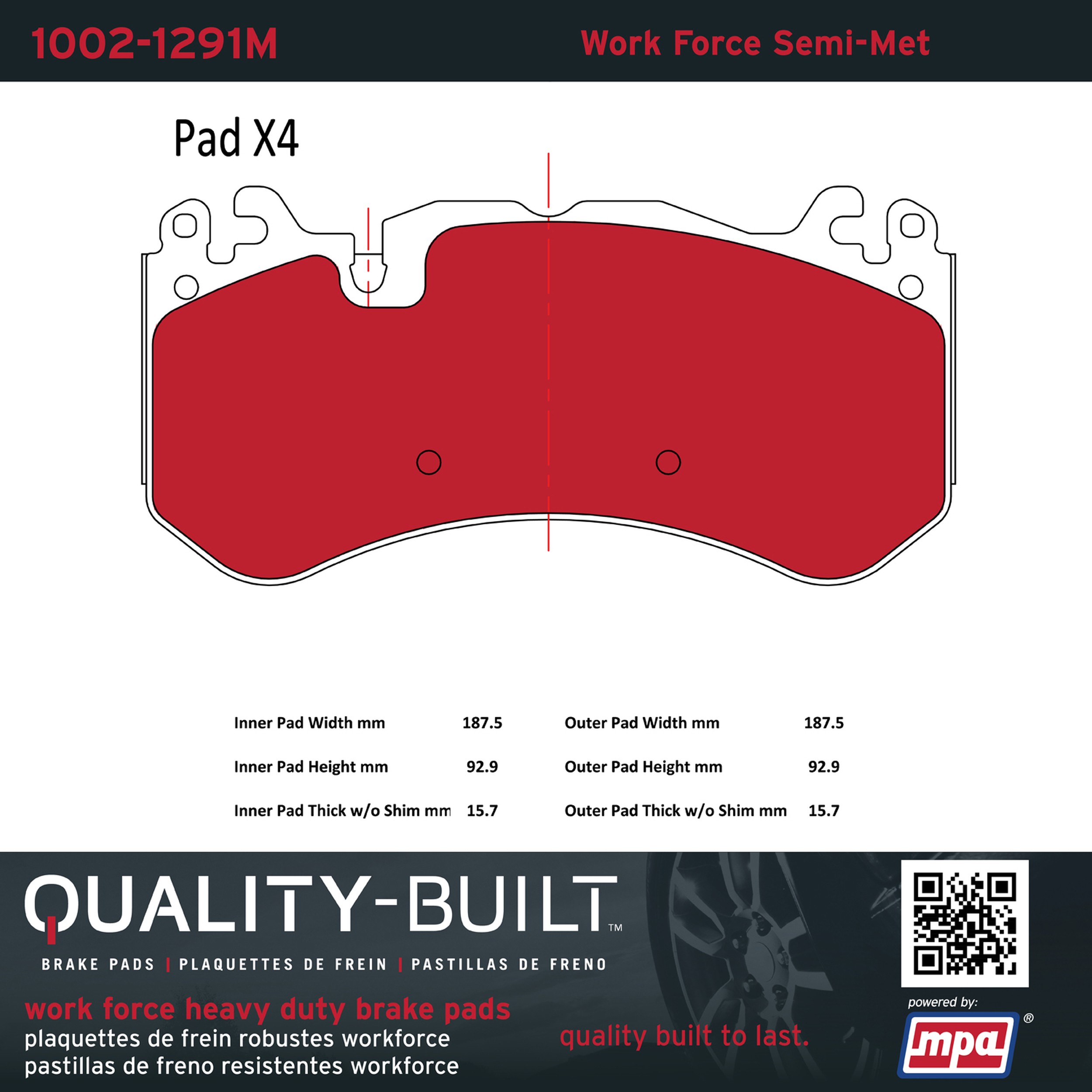 - Hardworking vehicles need hardworking brake pads, and Quality-Built Work force brake pads deliver every time. Specially formulated friction compounds are designed for high heat, heavy-duty use, where repeat stop situations, off-road driving, or towing push brake pads to the limits. Work force brake pads are an excellent choice for fleet use where extended service life and maximum durability are required.