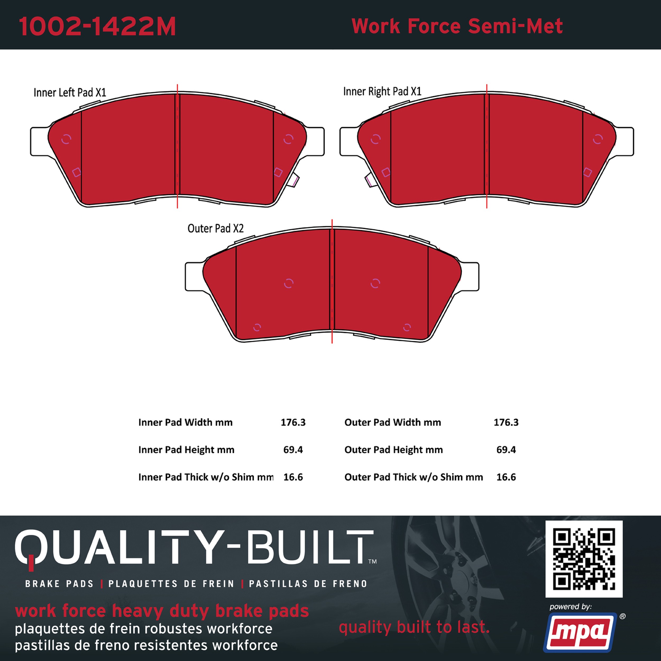 - Hardworking vehicles need hardworking brake pads, and Quality-Built Work force brake pads deliver every time. Specially formulated friction compounds are designed for high heat, heavy-duty use, where repeat stop situations, off-road driving, or towing push brake pads to the limits. Work force brake pads are an excellent choice for fleet use where extended service life and maximum durability are required.