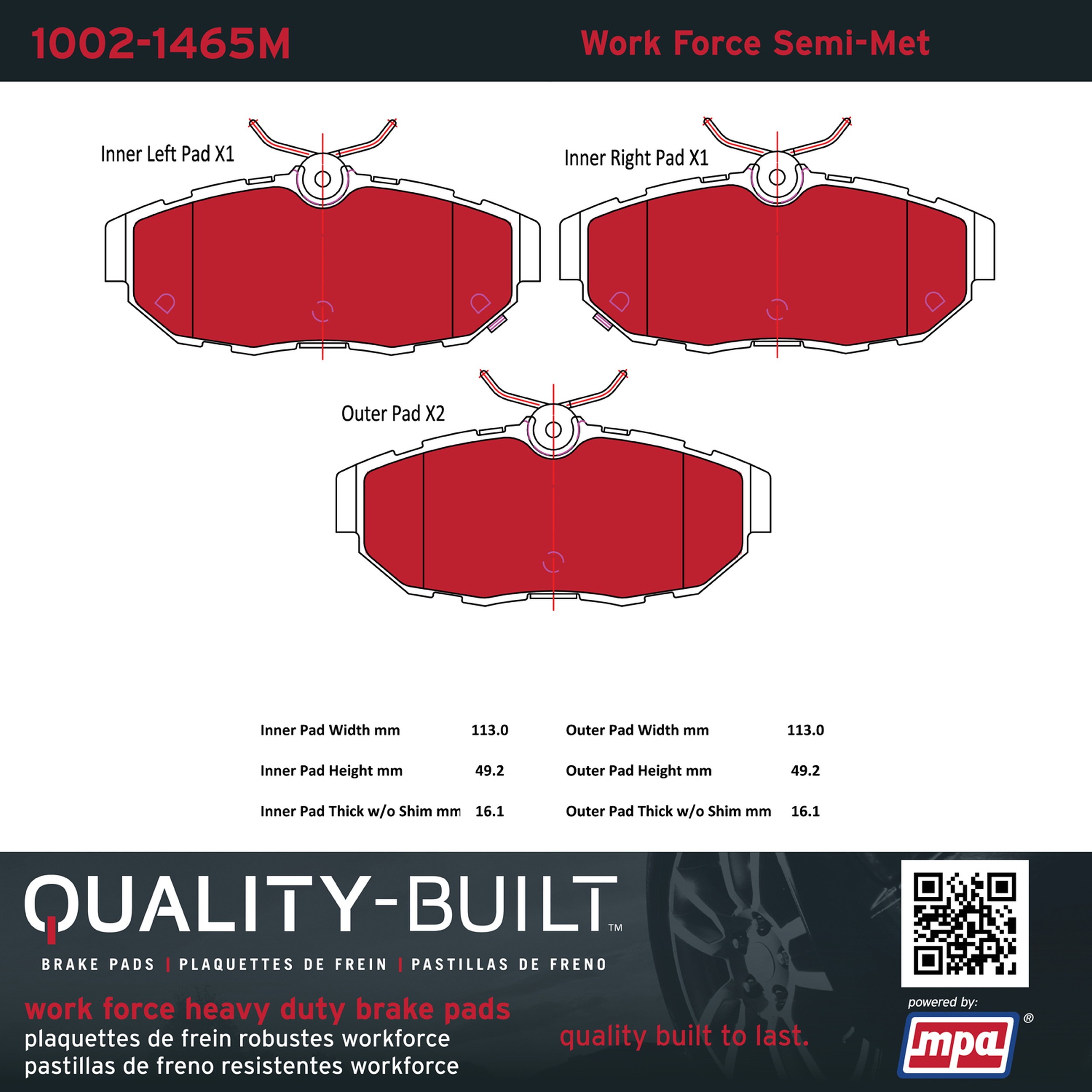 - Hardworking vehicles need hardworking brake pads, and Quality-Built Work force brake pads deliver every time. Specially formulated friction compounds are designed for high heat, heavy-duty use, where repeat stop situations, off-road driving, or towing push brake pads to the limits. Work force brake pads are an excellent choice for fleet use where extended service life and maximum durability are required.