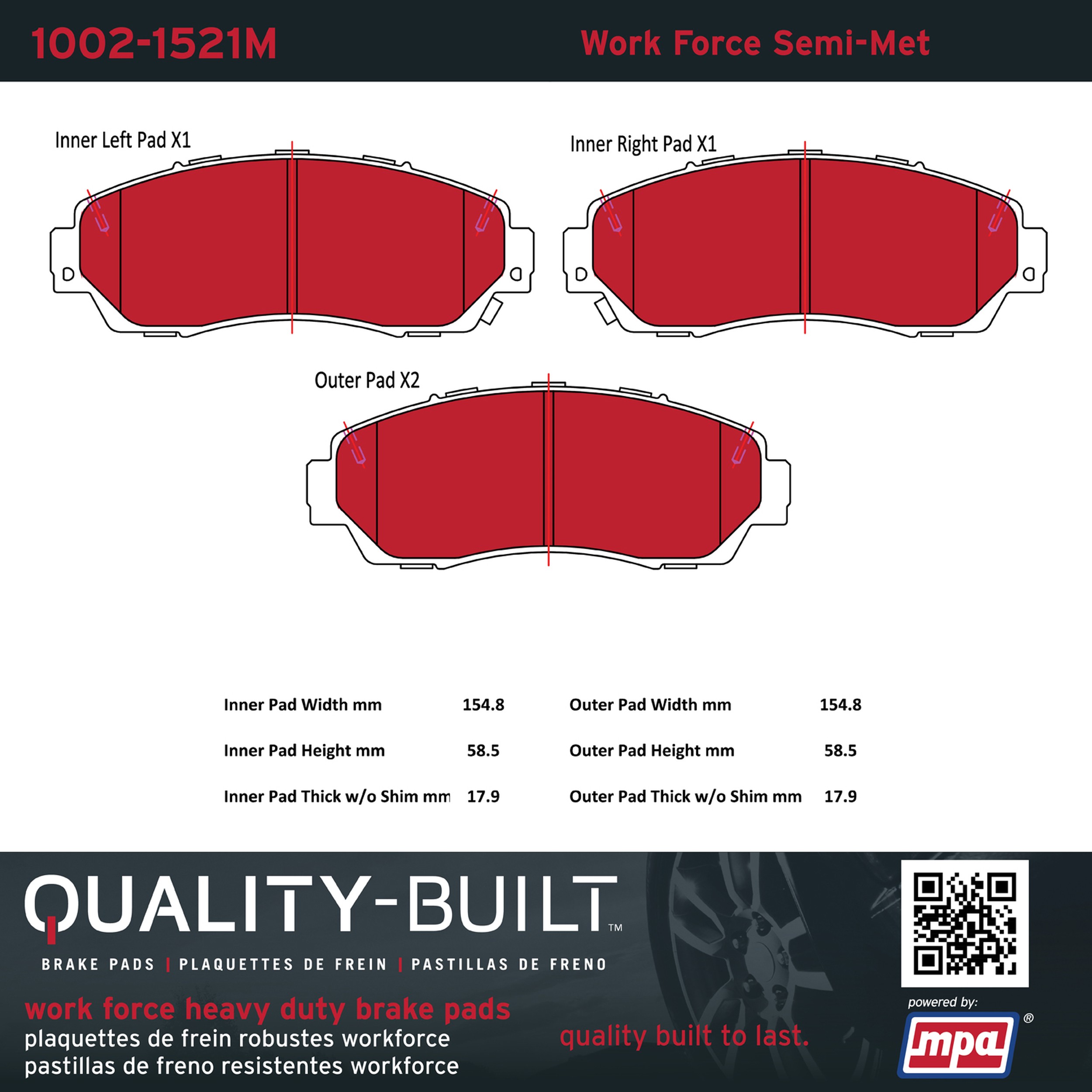 - Hardworking vehicles need hardworking brake pads, and Quality-Built Work force brake pads deliver every time. Specially formulated friction compounds are designed for high heat, heavy-duty use, where repeat stop situations, off-road driving, or towing push brake pads to the limits. Work force brake pads are an excellent choice for fleet use where extended service life and maximum durability are required.
