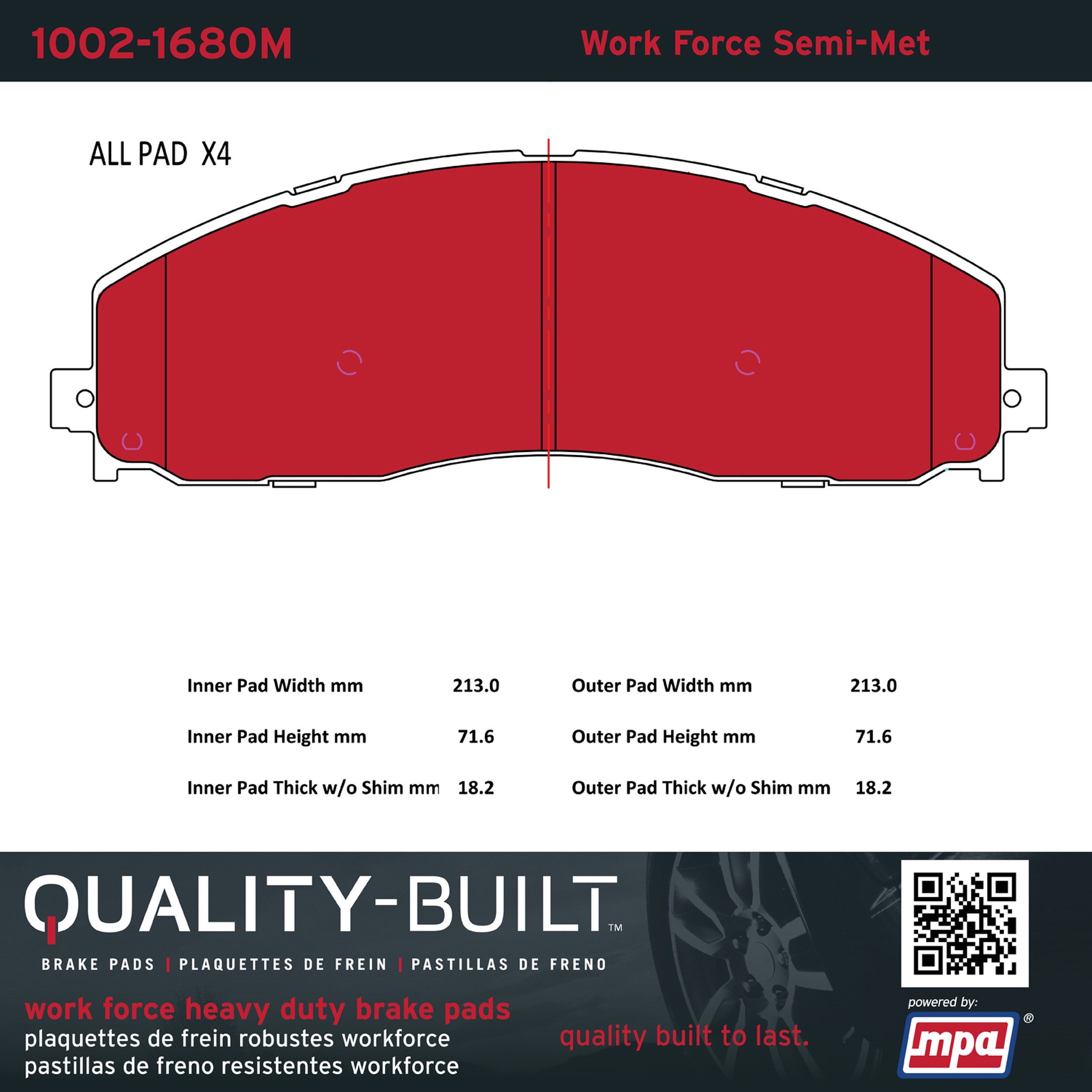 - Hardworking vehicles need hardworking brake pads, and Quality-Built Work force brake pads deliver every time. Specially formulated friction compounds are designed for high heat, heavy-duty use, where repeat stop situations, off-road driving, or towing push brake pads to the limits. Work force brake pads are an excellent choice for fleet use where extended service life and maximum durability are required.