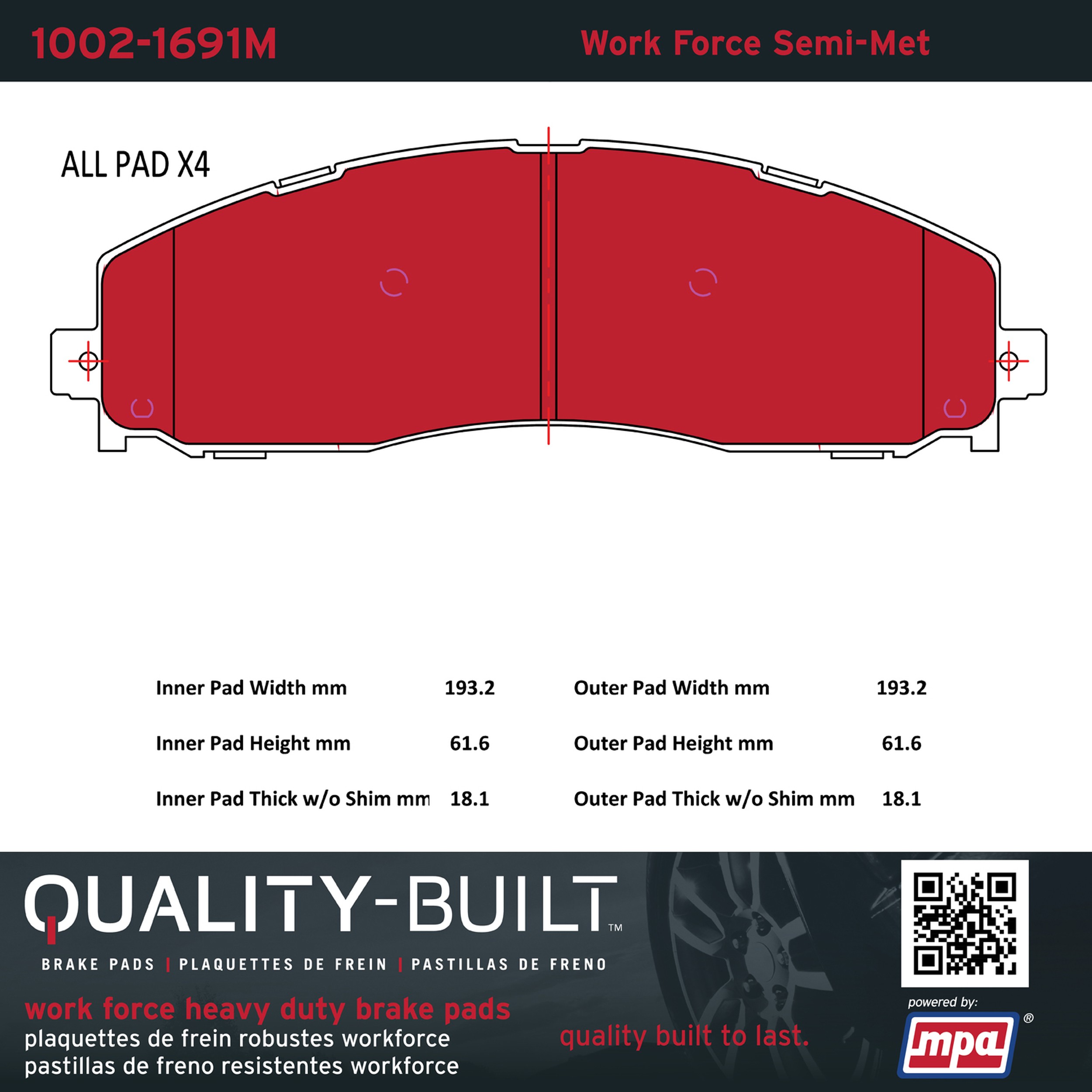 - Hardworking vehicles need hardworking brake pads, and Quality-Built Work force brake pads deliver every time. Specially formulated friction compounds are designed for high heat, heavy-duty use, where repeat stop situations, off-road driving, or towing push brake pads to the limits. Work force brake pads are an excellent choice for fleet use where extended service life and maximum durability are required.