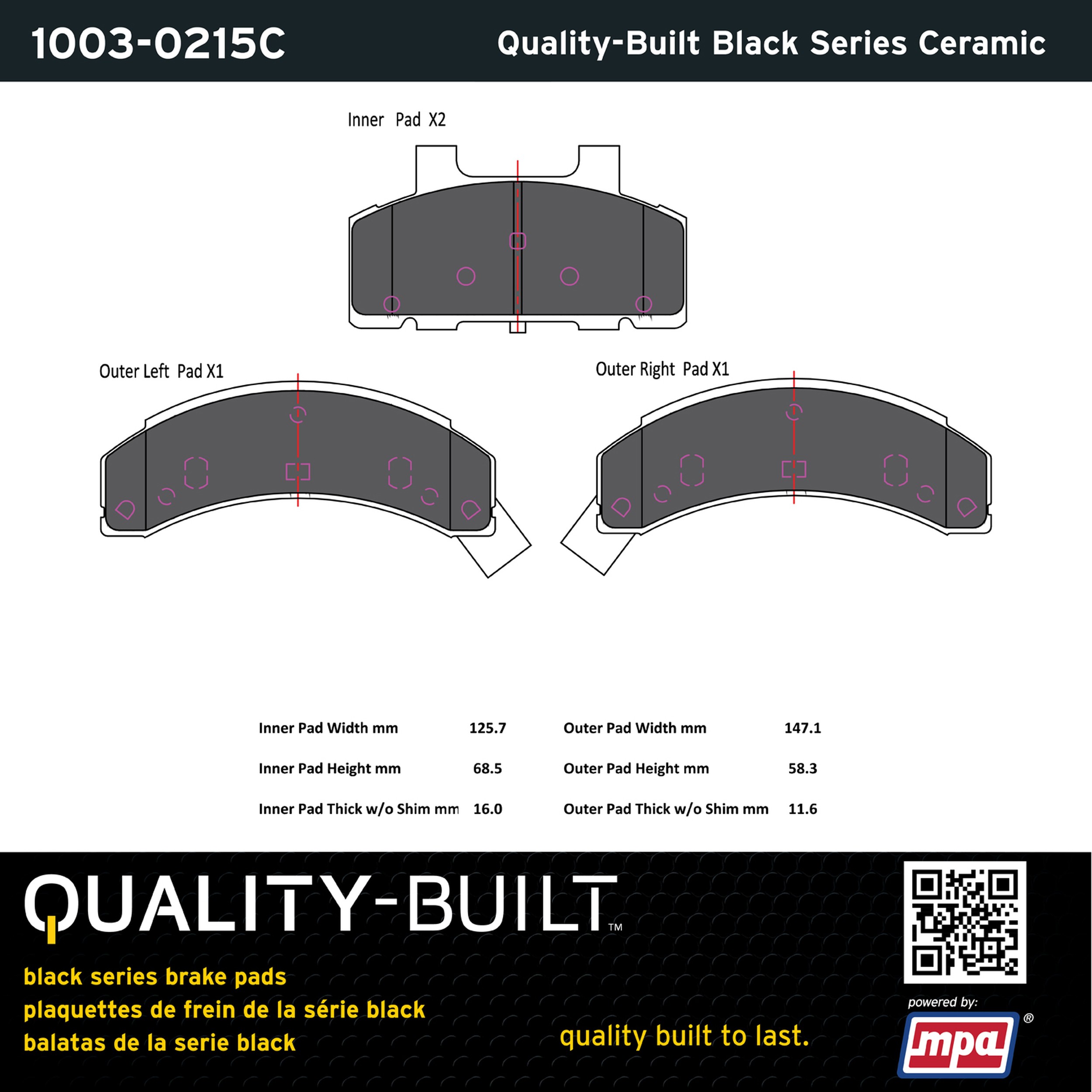 - Quality-Built Black Series Brake Pads are the ultimate in brake pad performance, delivering smooth, reliable stopping with zero noise and low dust. Application-specific friction formulas take the guesswork out of pad selection while providing even, predictable pedal feel and fade-free stopping power across a wide thermal range. Black Series friction compounds are engineered for optimized brake system performance and improved stopping power.