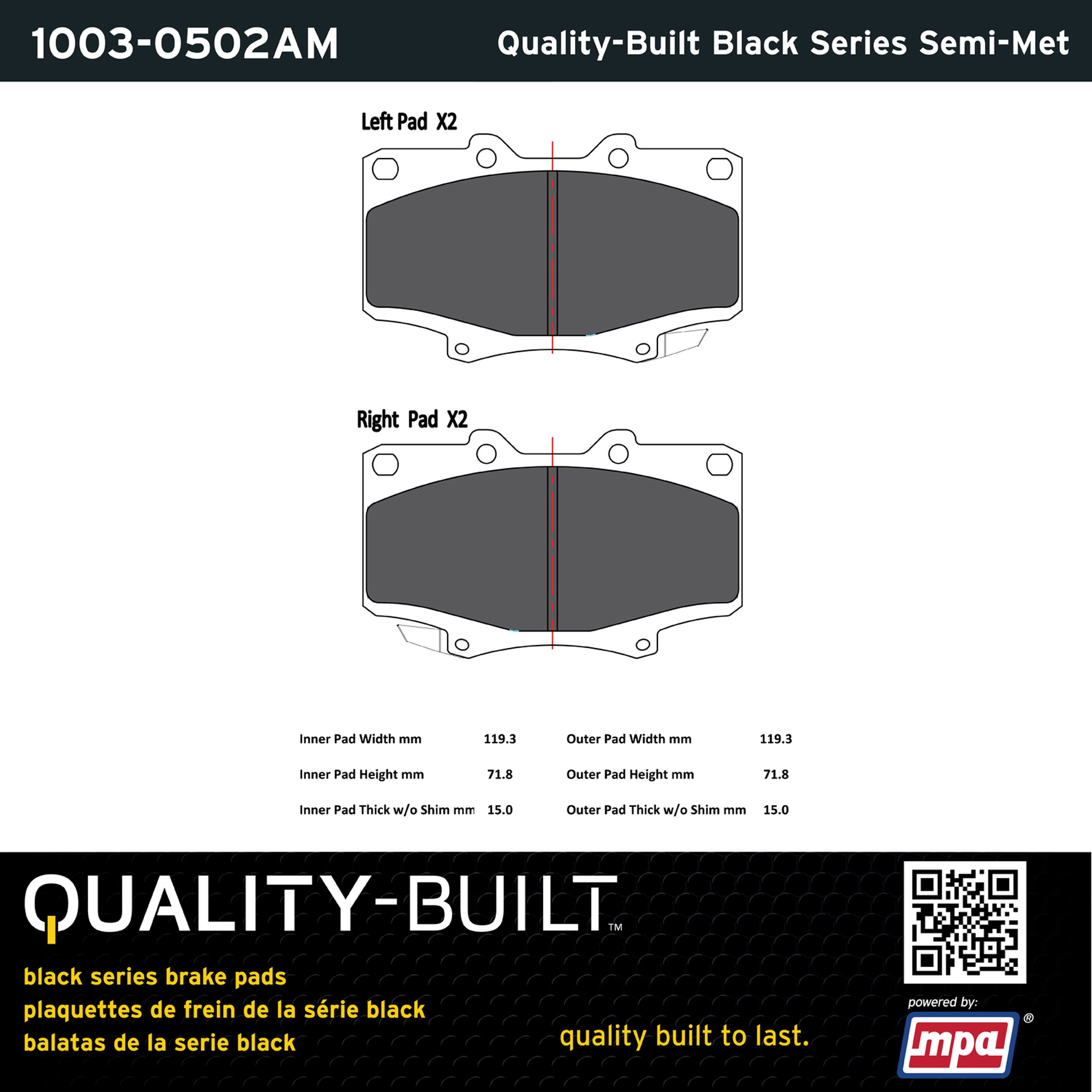 - Quality-Built Black Series Brake Pads are the ultimate in brake pad performance, delivering smooth, reliable stopping with zero noise and low dust. Application-specific friction formulas take the guesswork out of pad selection while providing even, predictable pedal feel and fade-free stopping power across a wide thermal range. Black Series friction compounds are engineered for optimized brake system performance and improved stopping power.