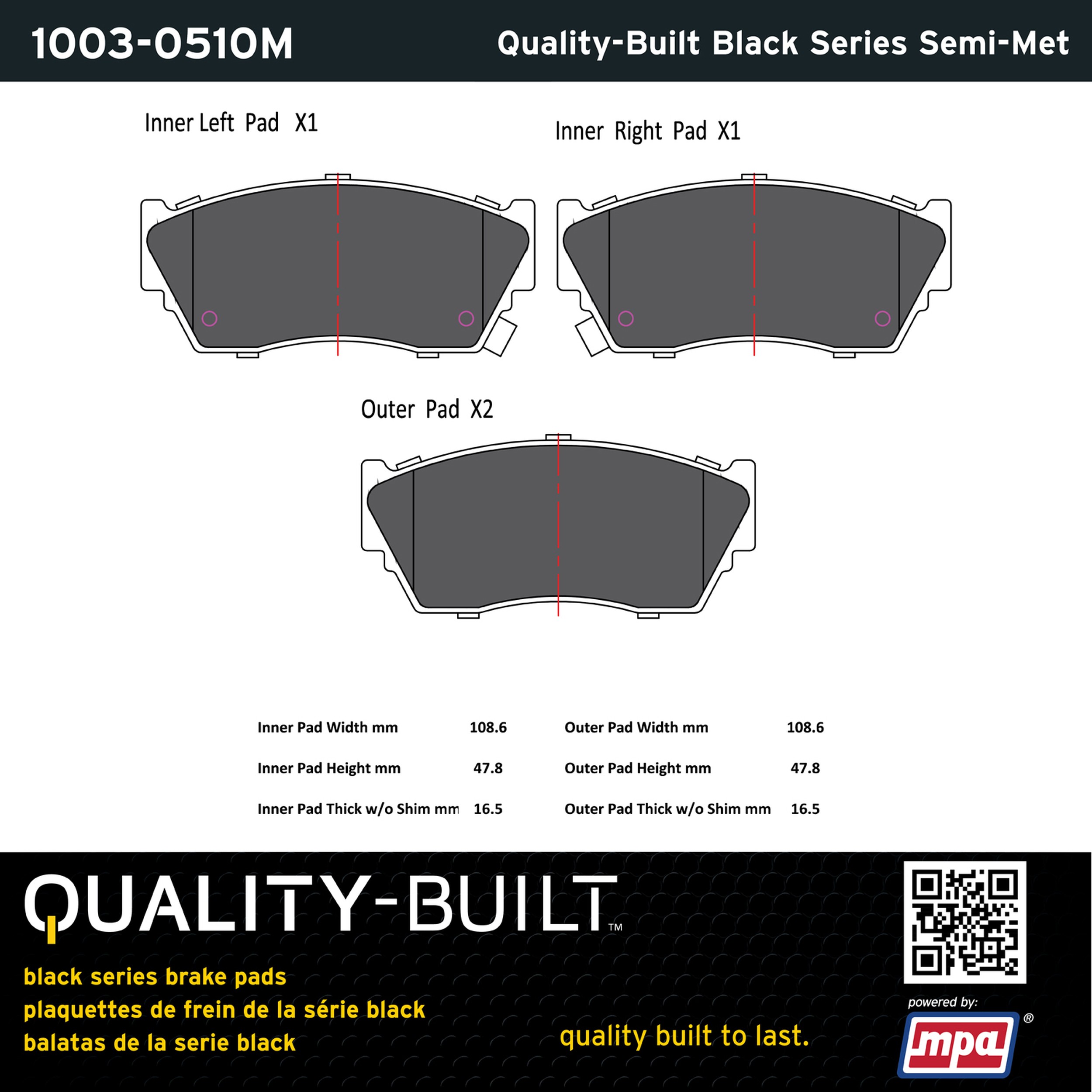 - Quality-Built Black Series Brake Pads are the ultimate in brake pad performance, delivering smooth, reliable stopping with zero noise and low dust. Application-specific friction formulas take the guesswork out of pad selection while providing even, predictable pedal feel and fade-free stopping power across a wide thermal range. Black Series friction compounds are engineered for optimized brake system performance and improved stopping power.