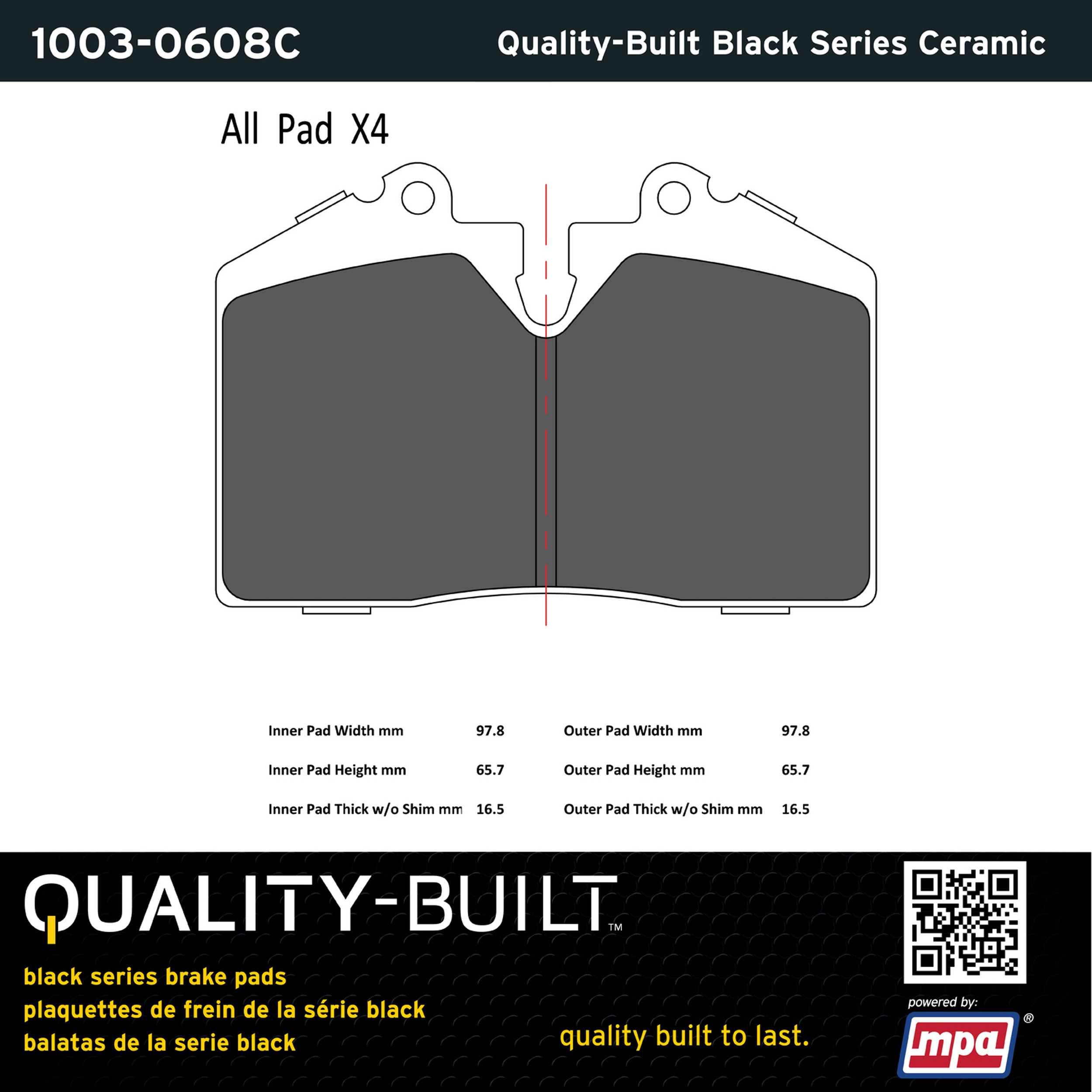 - Quality-Built Black Series Brake Pads are the ultimate in brake pad performance, delivering smooth, reliable stopping with zero noise and low dust. Application-specific friction formulas take the guesswork out of pad selection while providing even, predictable pedal feel and fade-free stopping power across a wide thermal range. Black Series friction compounds are engineered for optimized brake system performance and improved stopping power.