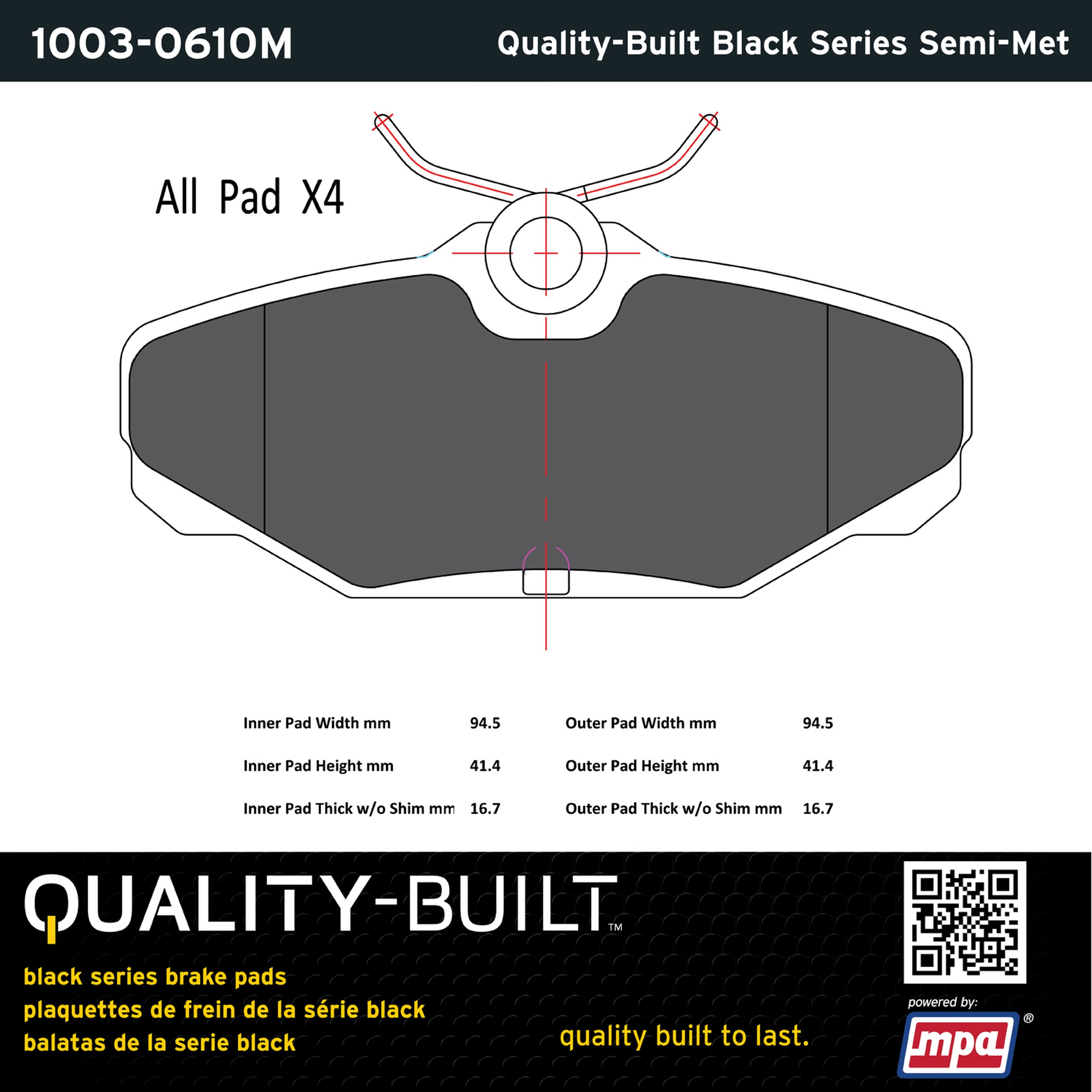 - Quality-Built Black Series Brake Pads are the ultimate in brake pad performance, delivering smooth, reliable stopping with zero noise and low dust. Application-specific friction formulas take the guesswork out of pad selection while providing even, predictable pedal feel and fade-free stopping power across a wide thermal range. Black Series friction compounds are engineered for optimized brake system performance and improved stopping power.
