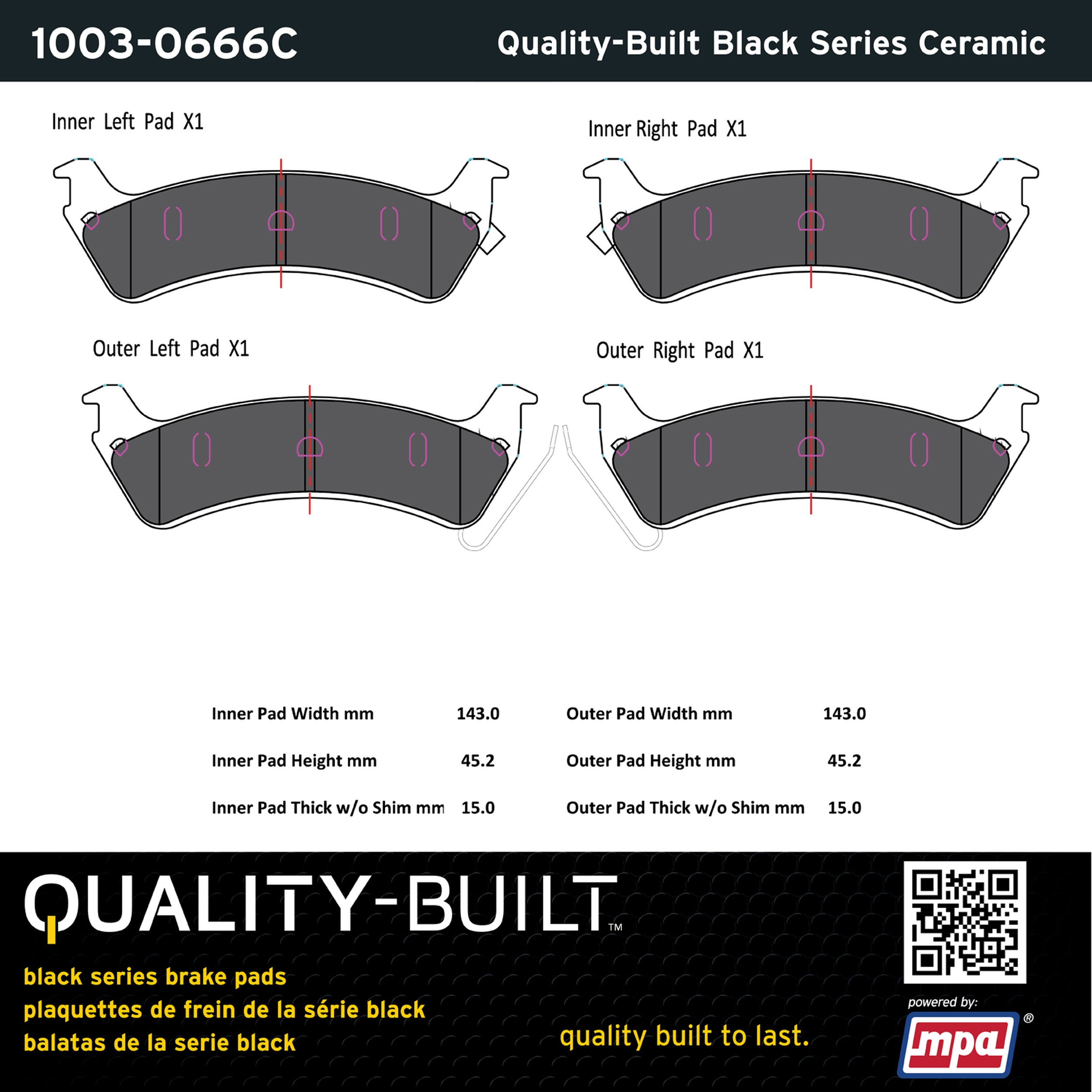 - Quality-Built Black Series Brake Pads are the ultimate in brake pad performance, delivering smooth, reliable stopping with zero noise and low dust. Application-specific friction formulas take the guesswork out of pad selection while providing even, predictable pedal feel and fade-free stopping power across a wide thermal range. Black Series friction compounds are engineered for optimized brake system performance and improved stopping power.