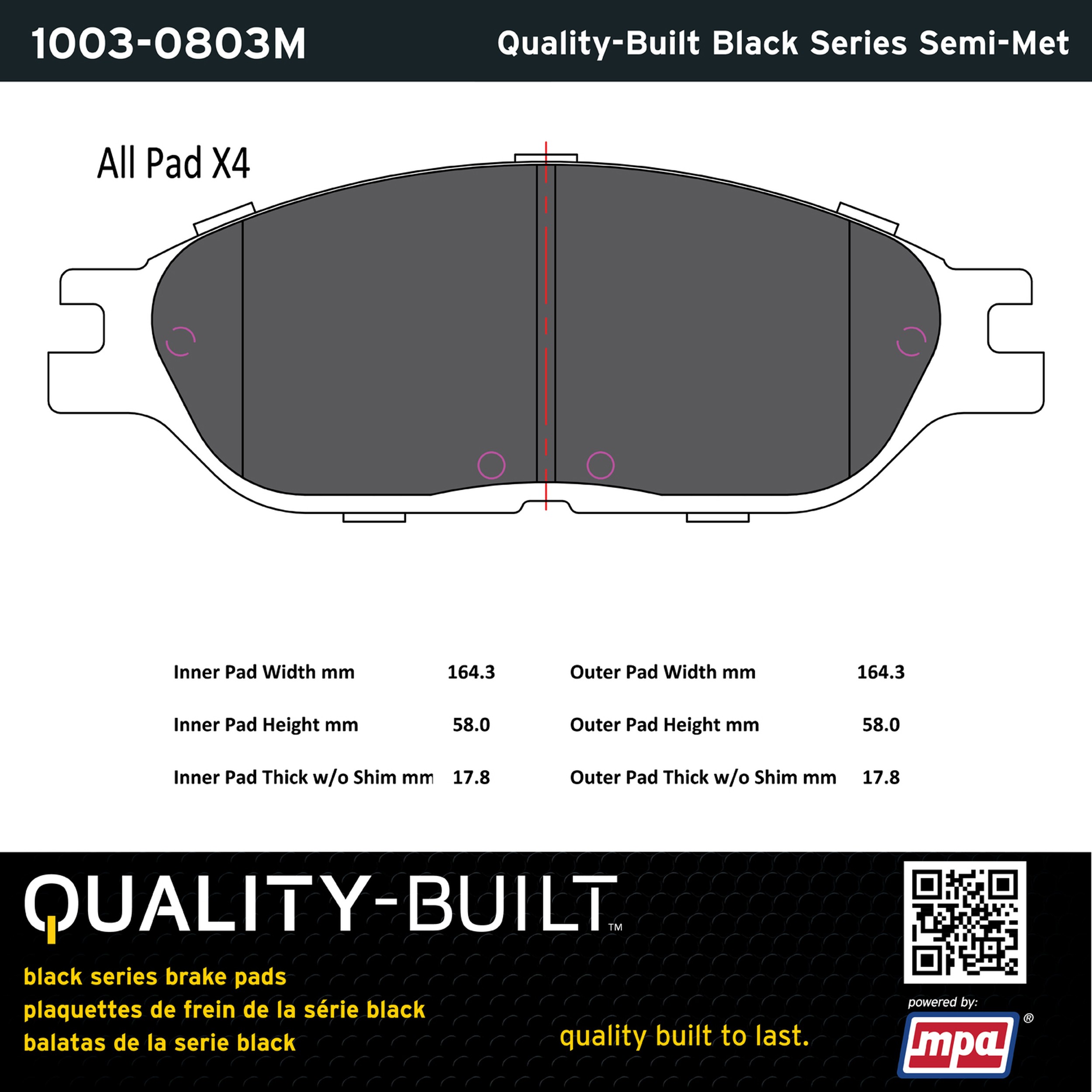 - Quality-Built Black Series Brake Pads are the ultimate in brake pad performance, delivering smooth, reliable stopping with zero noise and low dust. Application-specific friction formulas take the guesswork out of pad selection while providing even, predictable pedal feel and fade-free stopping power across a wide thermal range. Black Series friction compounds are engineered for optimized brake system performance and improved stopping power.