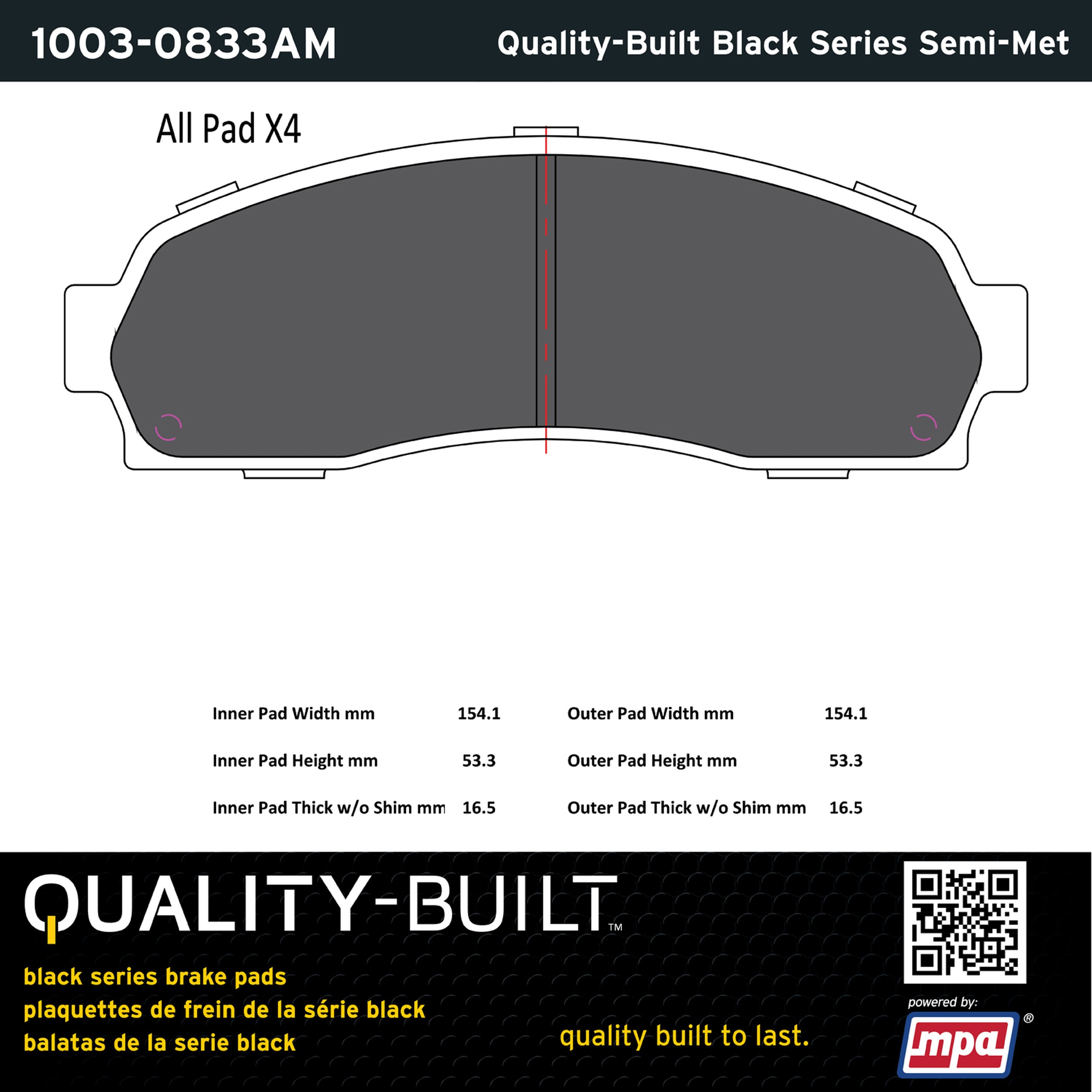 - Quality-Built Black Series Brake Pads are the ultimate in brake pad performance, delivering smooth, reliable stopping with zero noise and low dust. Application-specific friction formulas take the guesswork out of pad selection while providing even, predictable pedal feel and fade-free stopping power across a wide thermal range. Black Series friction compounds are engineered for optimized brake system performance and improved stopping power.