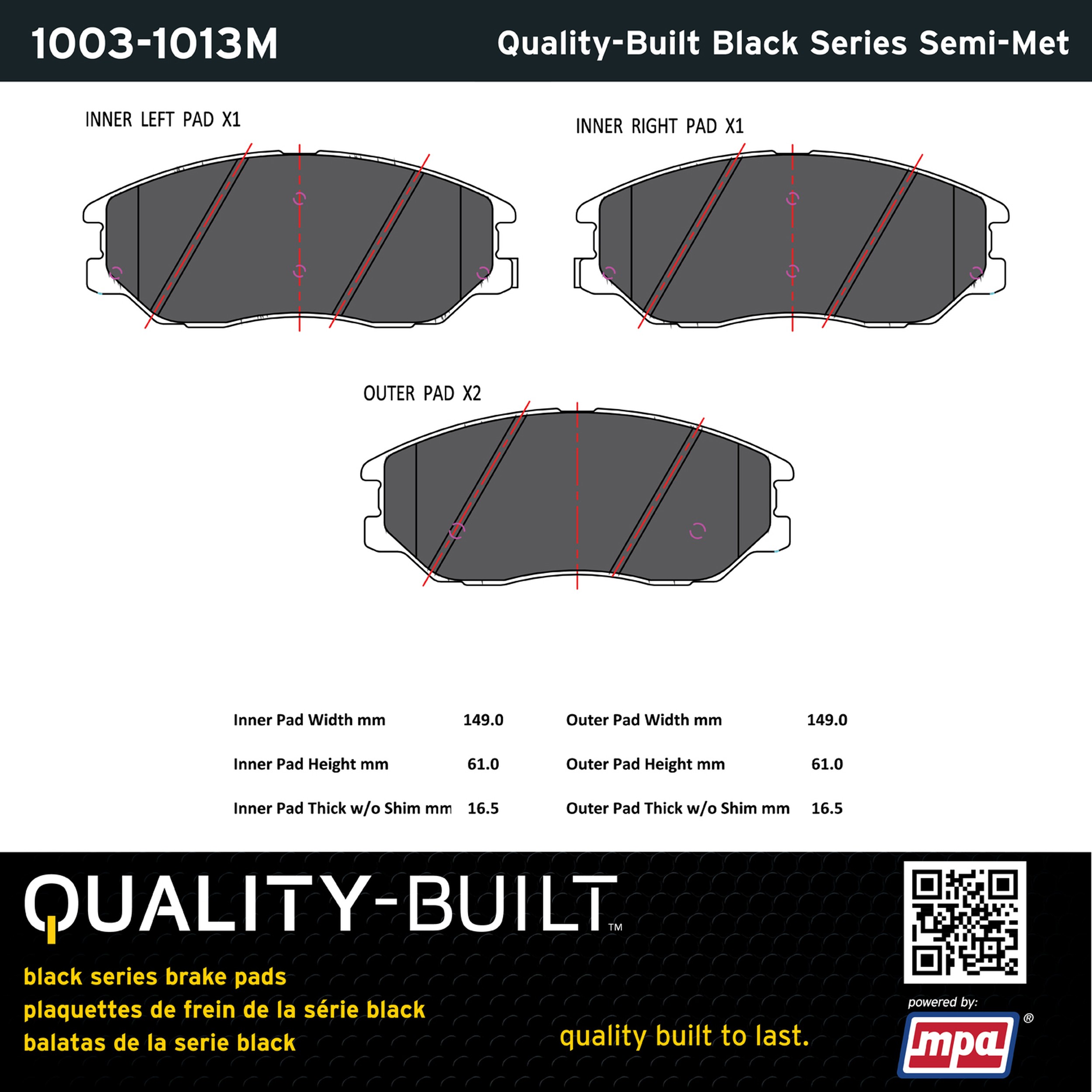 - Quality-Built Black Series Brake Pads are the ultimate in brake pad performance, delivering smooth, reliable stopping with zero noise and low dust. Application-specific friction formulas take the guesswork out of pad selection while providing even, predictable pedal feel and fade-free stopping power across a wide thermal range. Black Series friction compounds are engineered for optimized brake system performance and improved stopping power.