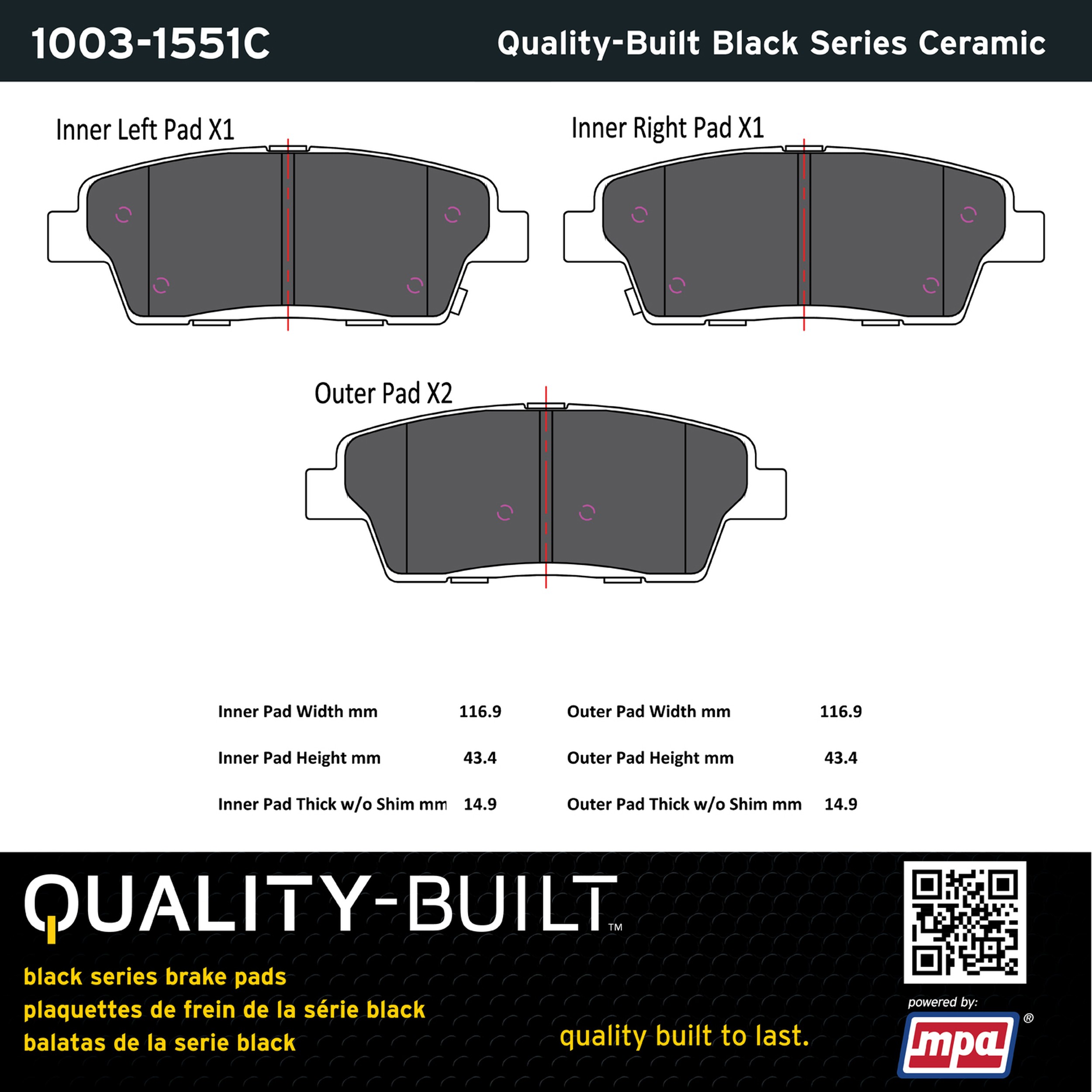 - Quality-Built Black Series Brake Pads are the ultimate in brake pad performance, delivering smooth, reliable stopping with zero noise and low dust. Application-specific friction formulas take the guesswork out of pad selection while providing even, predictable pedal feel and fade-free stopping power across a wide thermal range. Black Series friction compounds are engineered for optimized brake system performance and improved stopping power.