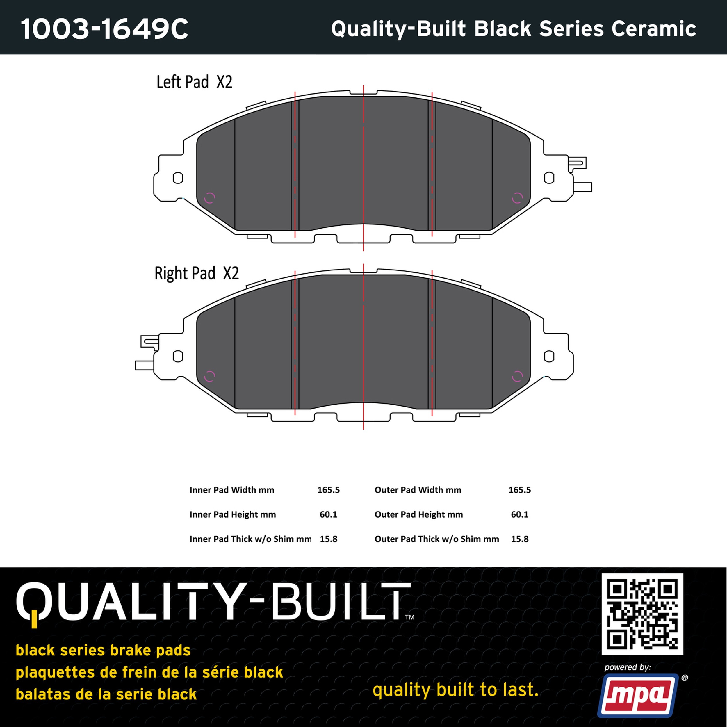 - Quality-Built Black Series Brake Pads are the ultimate in brake pad performance, delivering smooth, reliable stopping with zero noise and low dust. Application-specific friction formulas take the guesswork out of pad selection while providing even, predictable pedal feel and fade-free stopping power across a wide thermal range. Black Series friction compounds are engineered for optimized brake system performance and improved stopping power.