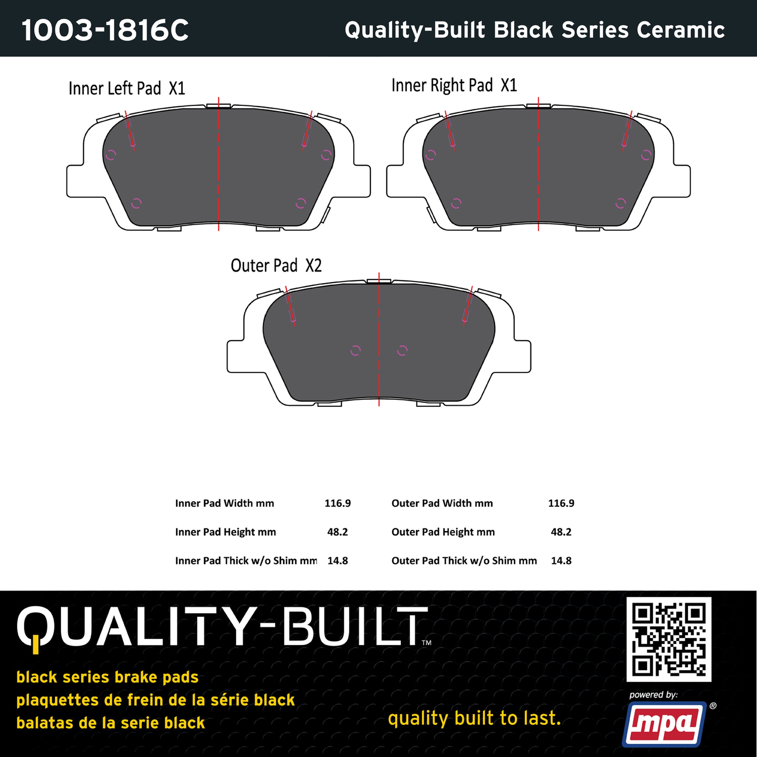 - Quality-Built Black Series Brake Pads are the ultimate in brake pad performance, delivering smooth, reliable stopping with zero noise and low dust. Application-specific friction formulas take the guesswork out of pad selection while providing even, predictable pedal feel and fade-free stopping power across a wide thermal range. Black Series friction compounds are engineered for optimized brake system performance and improved stopping power.