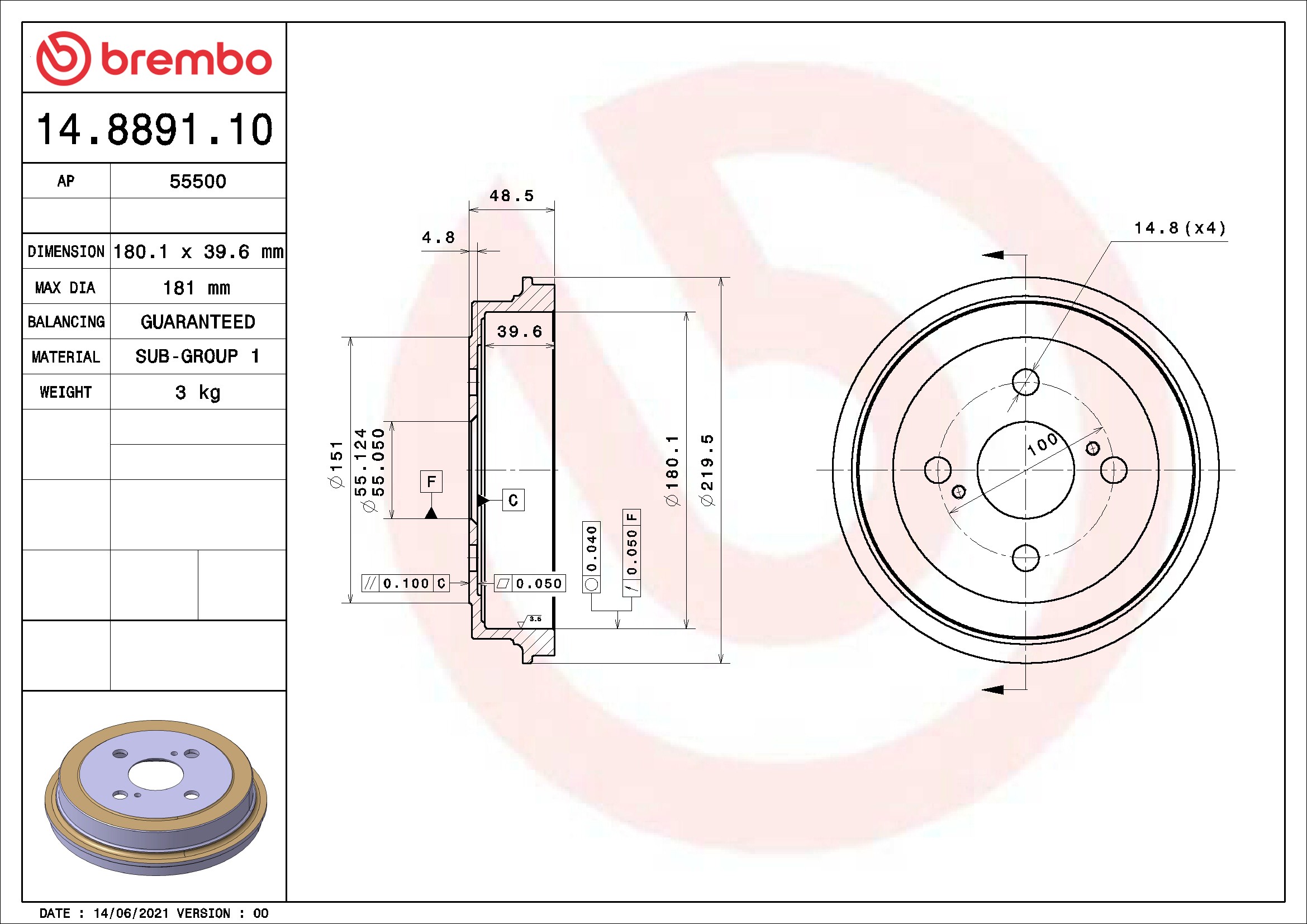 Brembo® 14.8891.10 Brake Drum