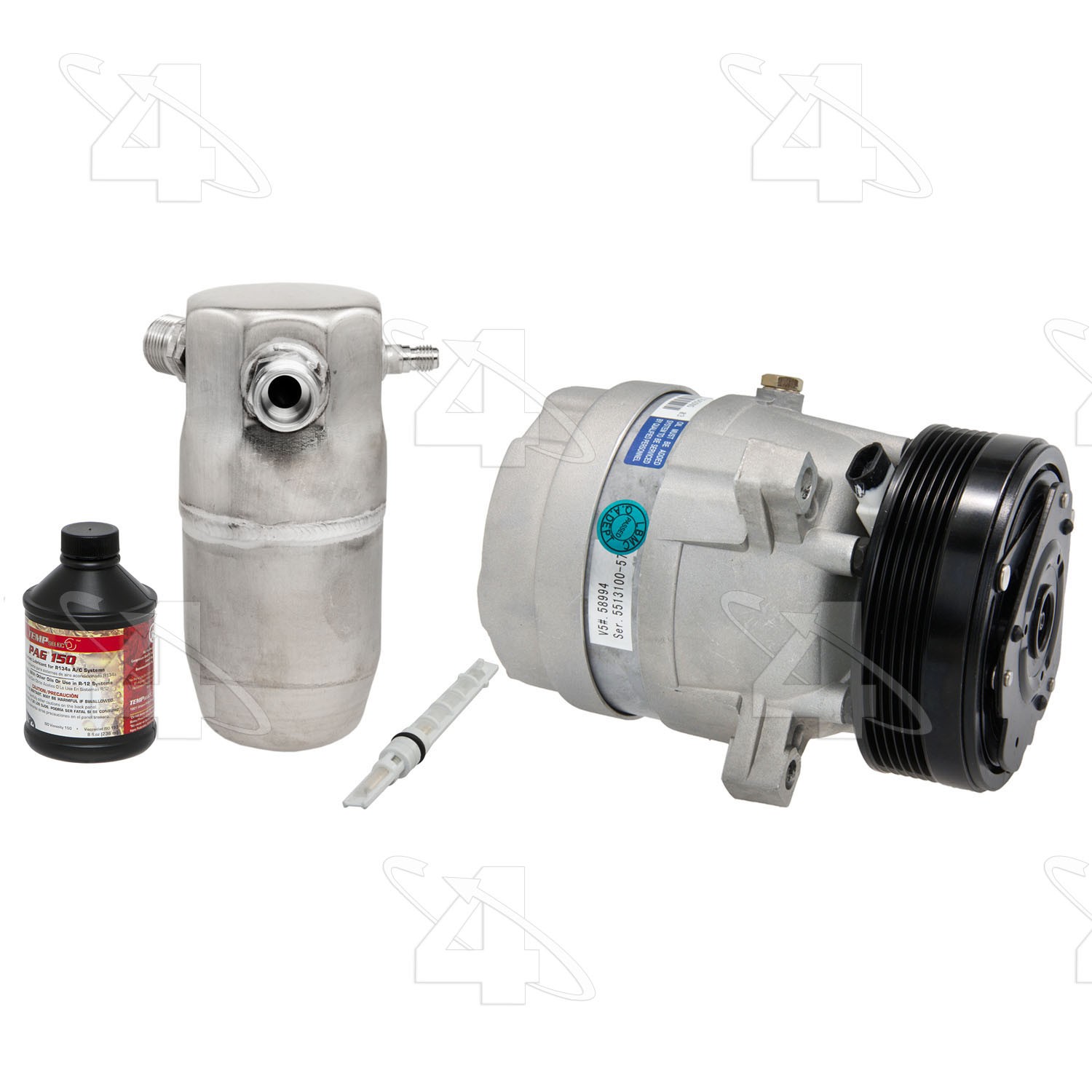 | Kit Includes | 58994 (new compressor), 33104 (accum), 38623 (orifice), 59003 (oil), o-rings |