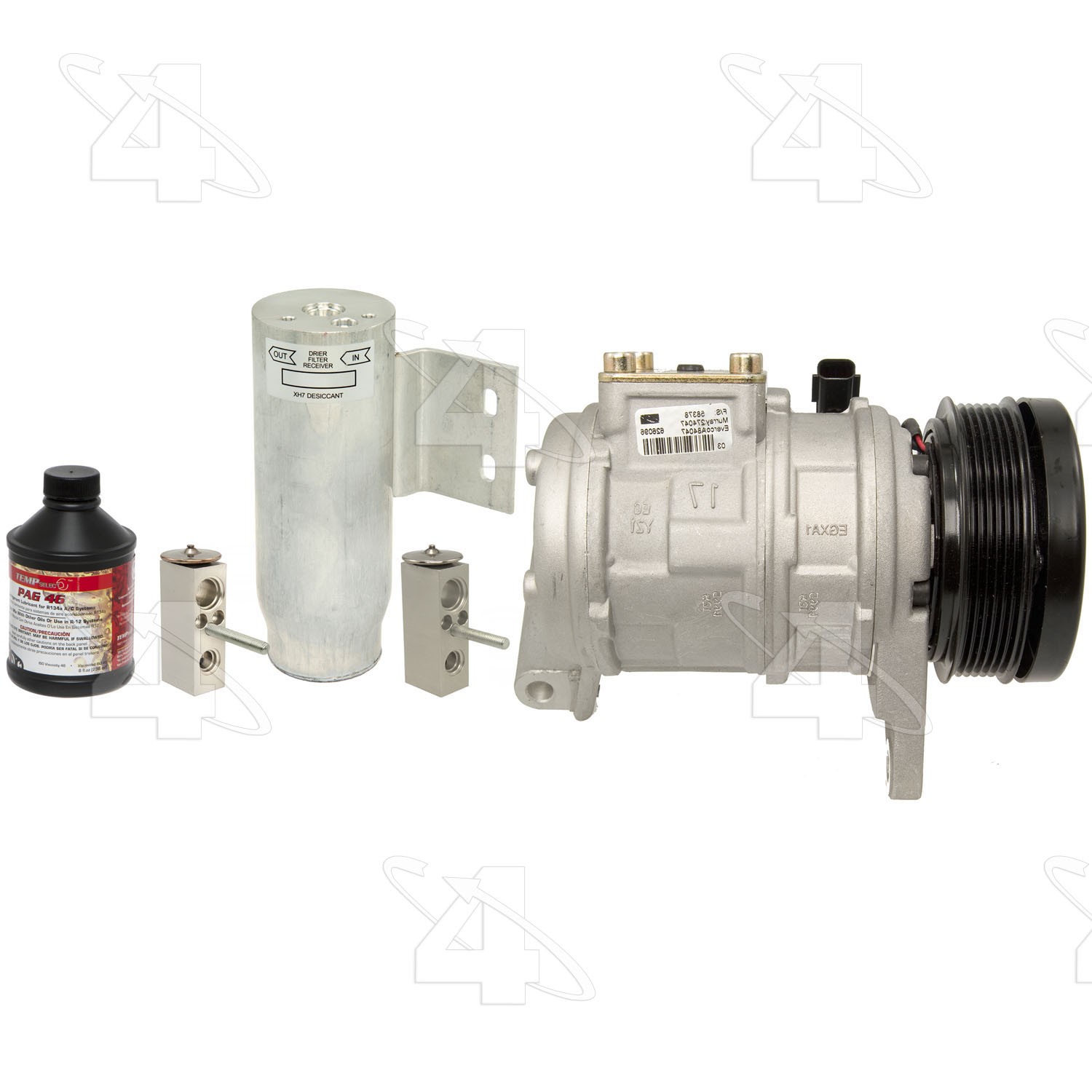 | Kit Includes | 58378 (new compressor), 33601 (filter drier), 38807 (exp valve), 38808 (exp valve), 59007 (oil), o-rings |