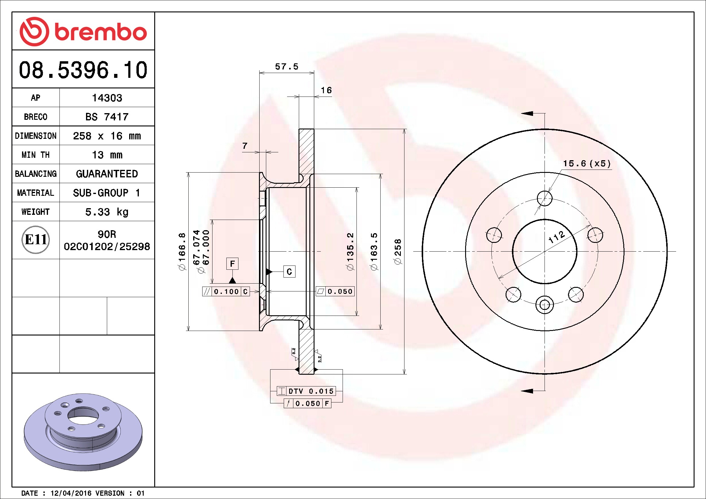 Brembo® 08.5396.10 Disc Brake Rotor