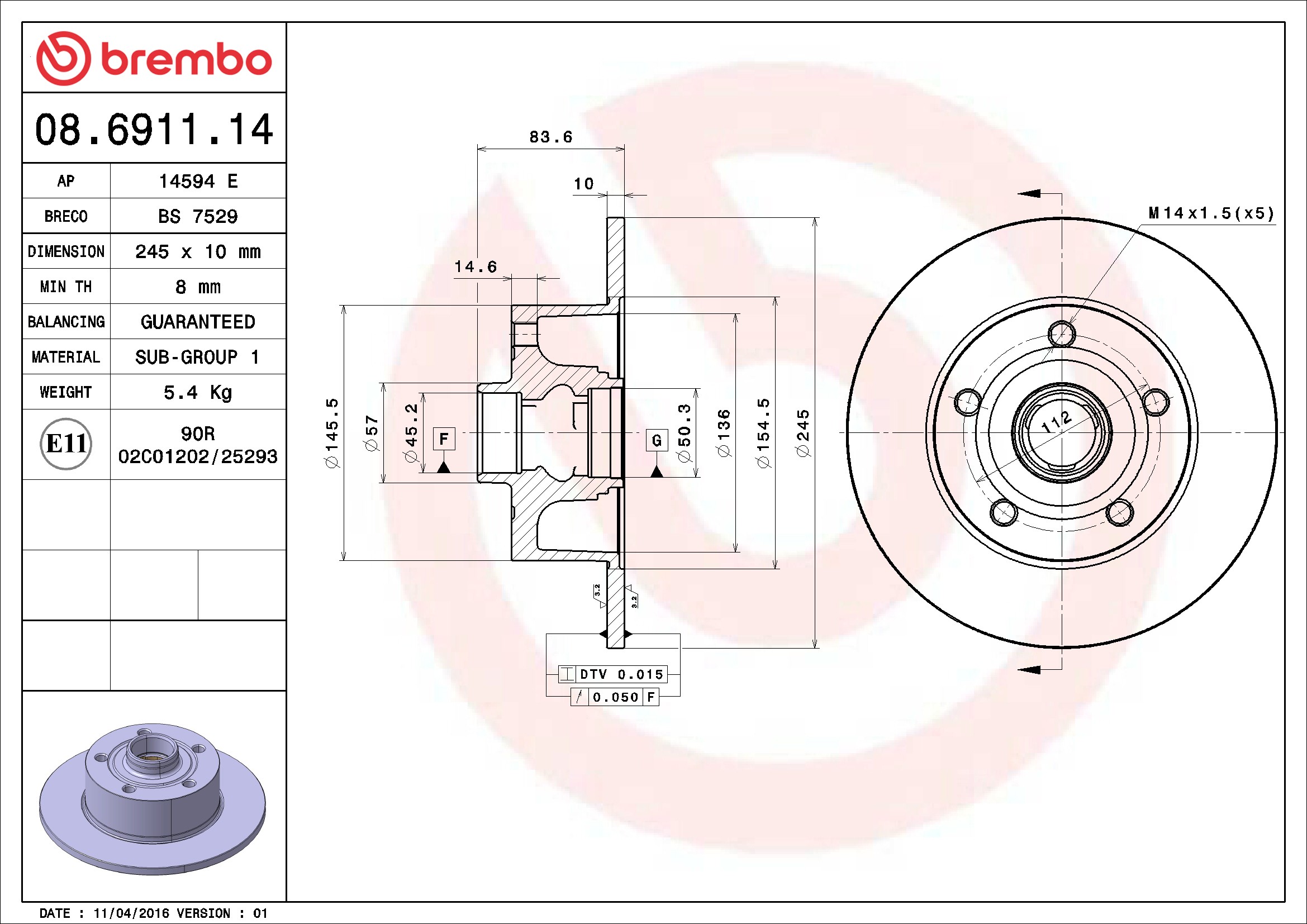 Brembo® 08.6911.14 Disc Brake Rotor