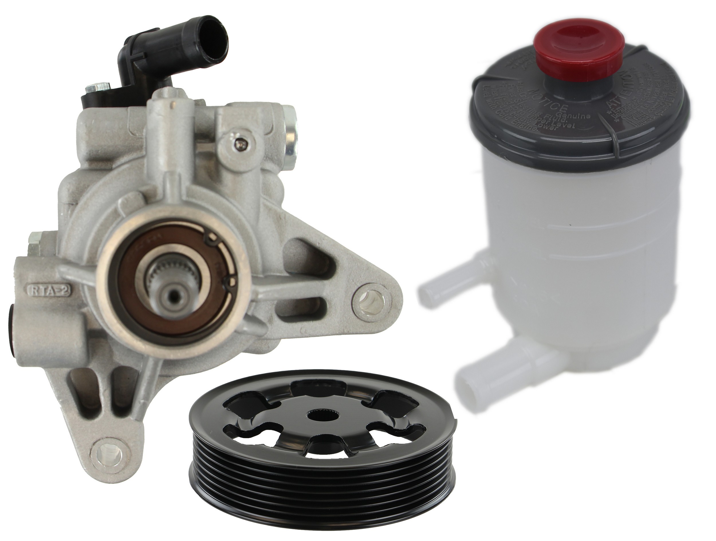 - Comes as complete kit with new pump, pulley, return pipe, o-ring, and reservoir.