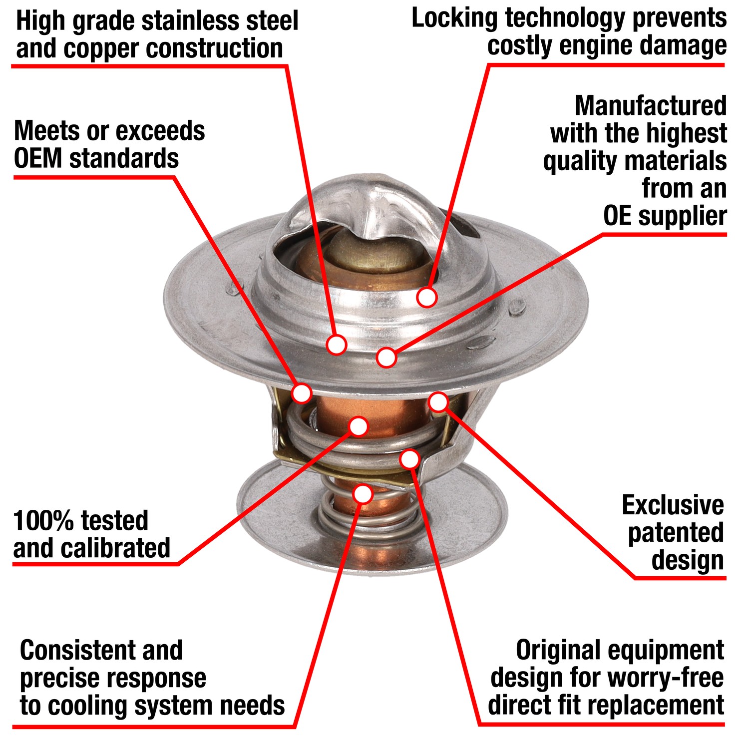 - Manufactured with OEM quality materials and safety standards by an OE Supplier. Stands up to even the most demanding automotive cooling systems. Manufactured with OEM specifications and processes. Copper case and wax compound assures rapid response to temperature changes in the coolant. Offset design, air relief valve, and OEM style seals included where applicable