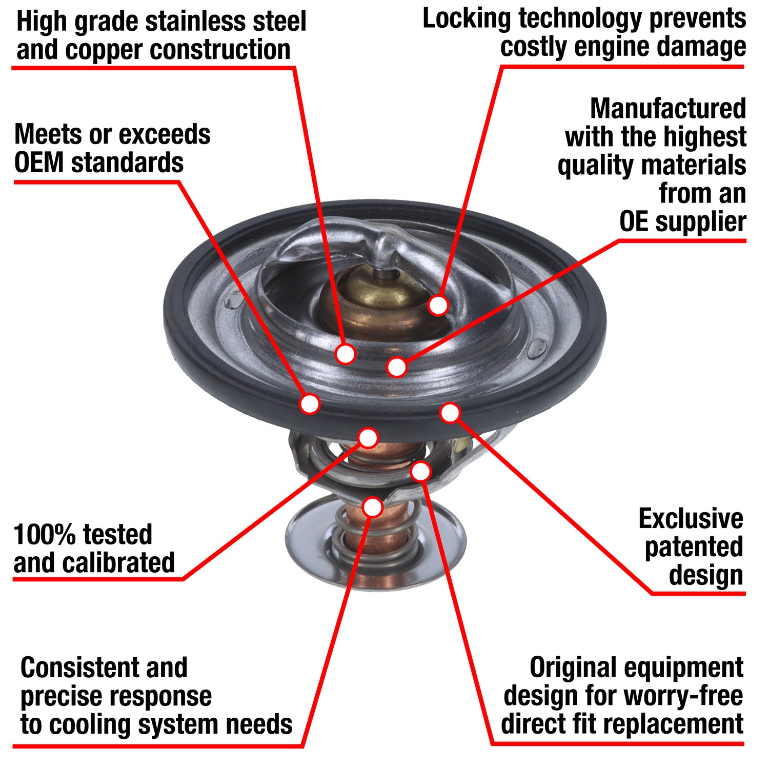 - Manufactured with OEM quality materials and safety standards by an OE Supplier. Stands up to even the most demanding automotive cooling systems. Manufactured with OEM specifications and processes. Copper case and wax compound assures rapid response to temperature changes in the coolant. Offset design, air relief valve, and OEM style seals included where applicable