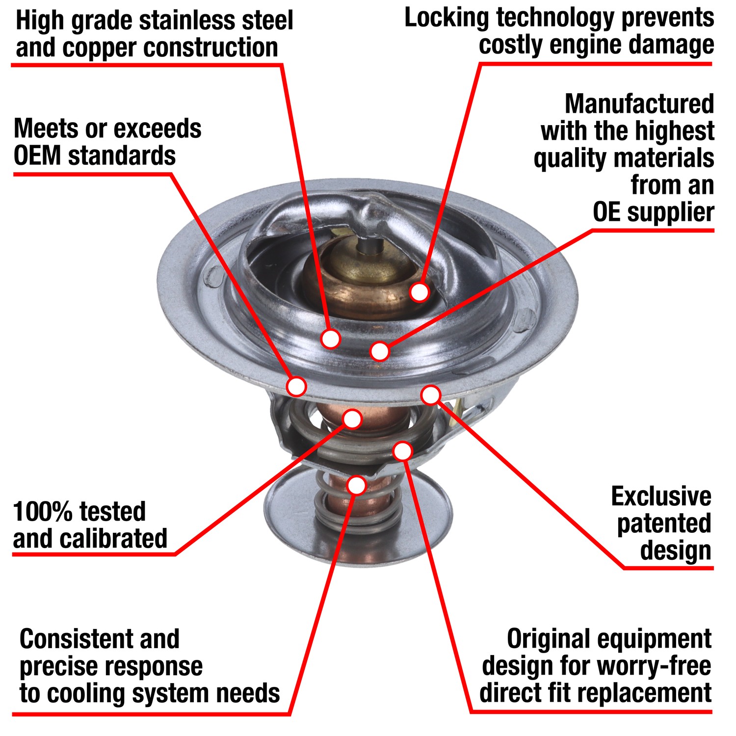 - Manufactured with OEM quality materials and safety standards by an OE Supplier. Stands up to even the most demanding automotive cooling systems. Manufactured with OEM specifications and processes. Copper case and wax compound assures rapid response to temperature changes in the coolant. Offset design, air relief valve, and OEM style seals included where applicable