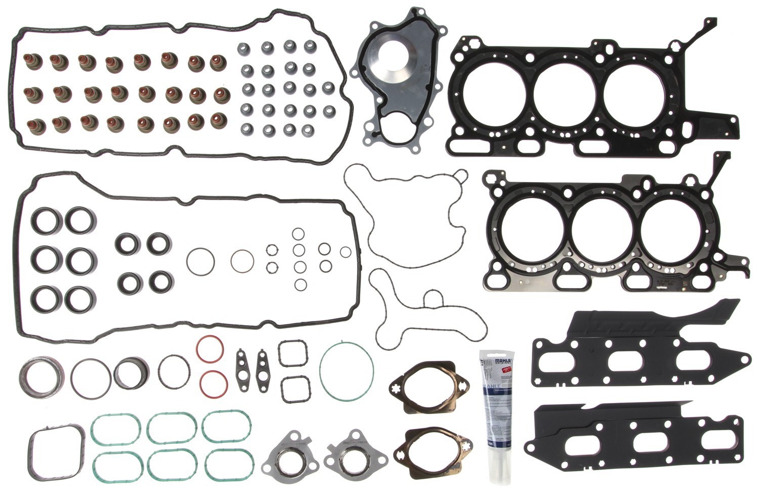 | Additional Package Contents | Contains block heater o-ring, camshaft (vct solenoid) seals, coolant inlet pipe o-rings, cylinder head gaskets, exhaust manifold gaskets, fuel injector seals, fuel pump gaskets, intake manifold gaskets, rtv, spark plug tube seals, thermostat housing gasket, thermostat o-ring, throttle body gasket, timing chain tensioner o-rings, timing cover radial seal, timing cover seal, turbocharger mounting gaskets and seals (right and left sides), valve cover gaskets, valve cover grommets, valve stem seals, water crossover gaskets, water pump gasket (serpentine belt driven), water pump gaskets (timing chain driven), water pump mounting o-ring |