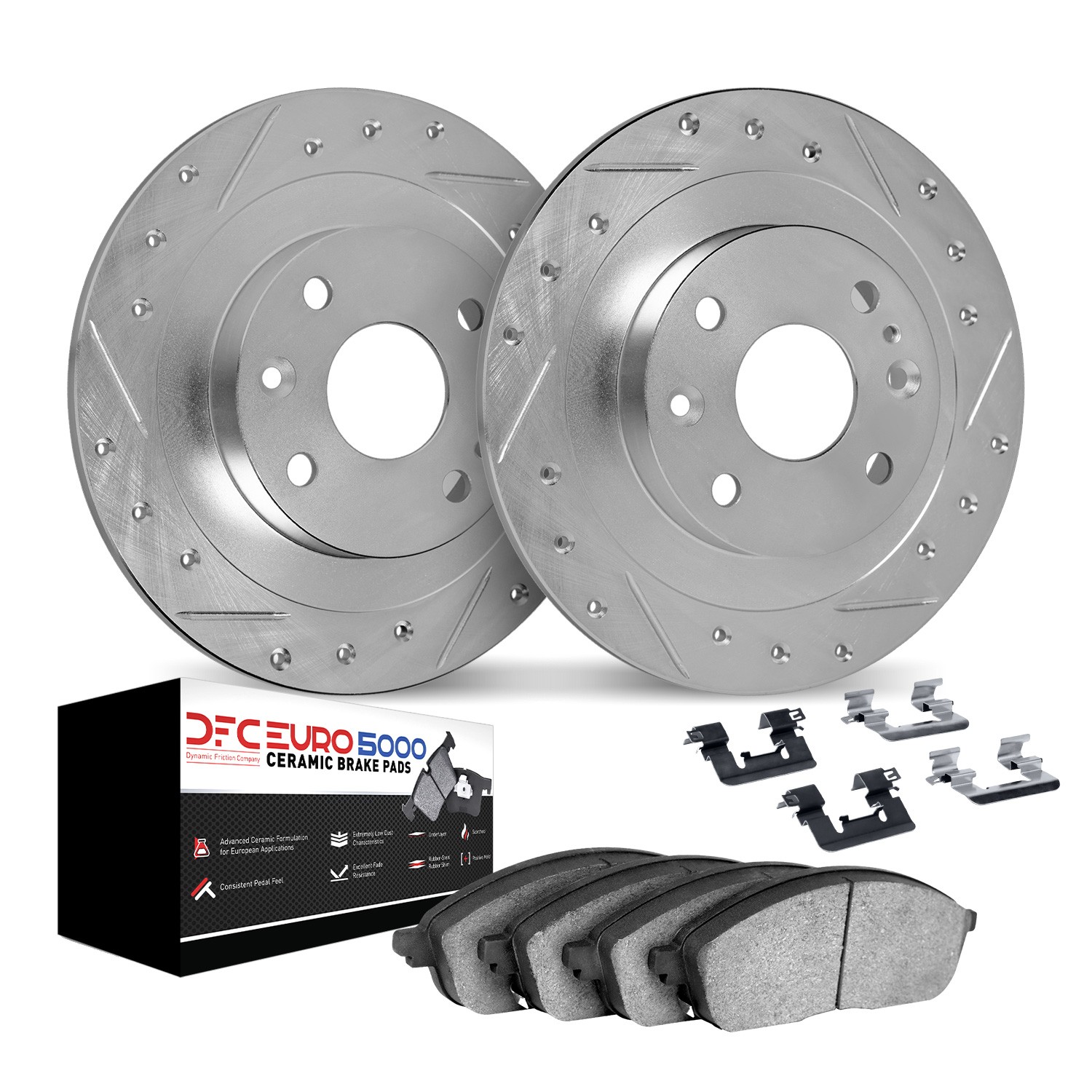 - DFC Rotors-Drilled & Slotted-Silver w/ EURO 5000 Ceramic Brake Pads Incl Hdw