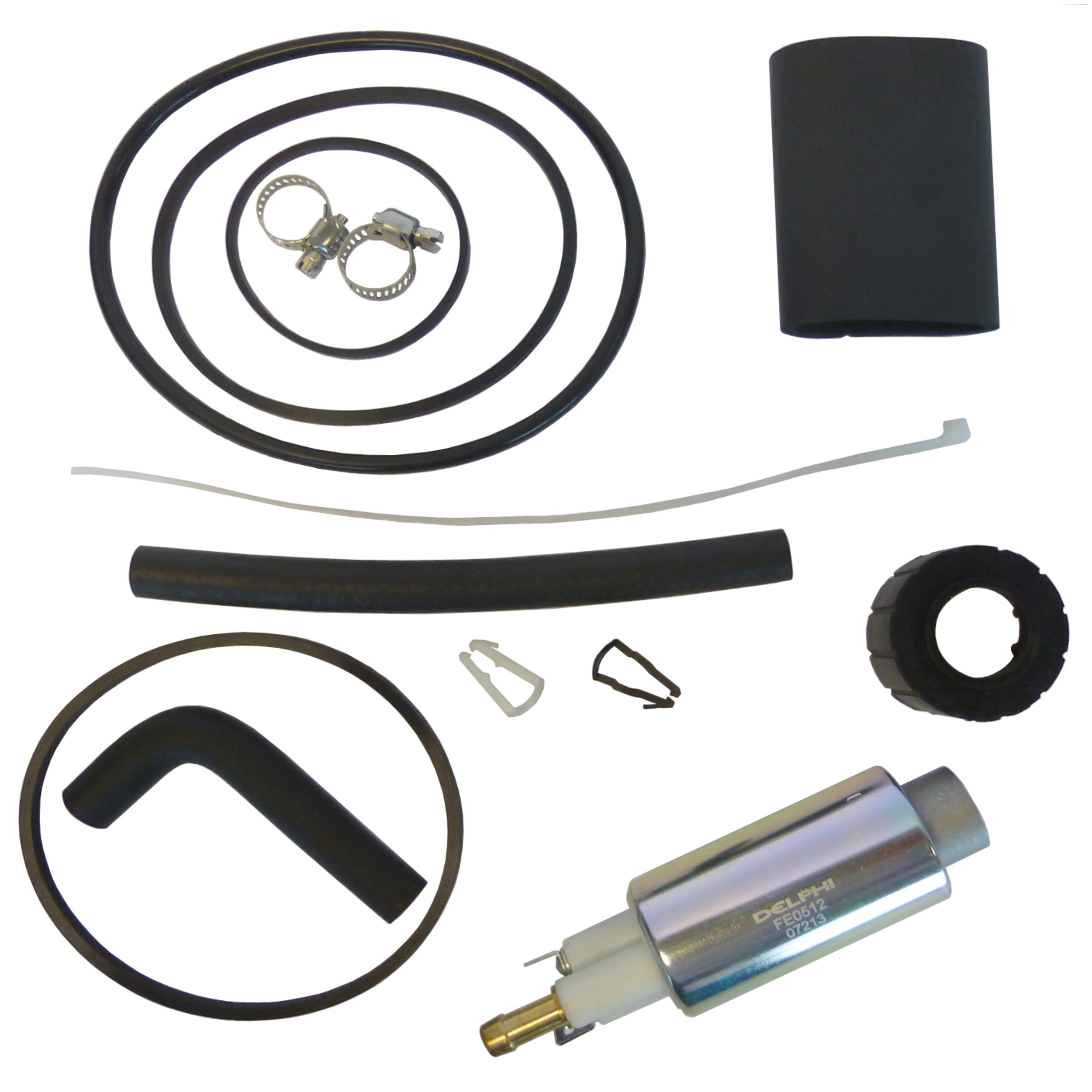 | Package Contents | Electric fuel pump, (2) hose clamps, hose pieces, insulating sleeve, isolator, (2) retaining clips, (4) seals, zip tie, instruction sheet |