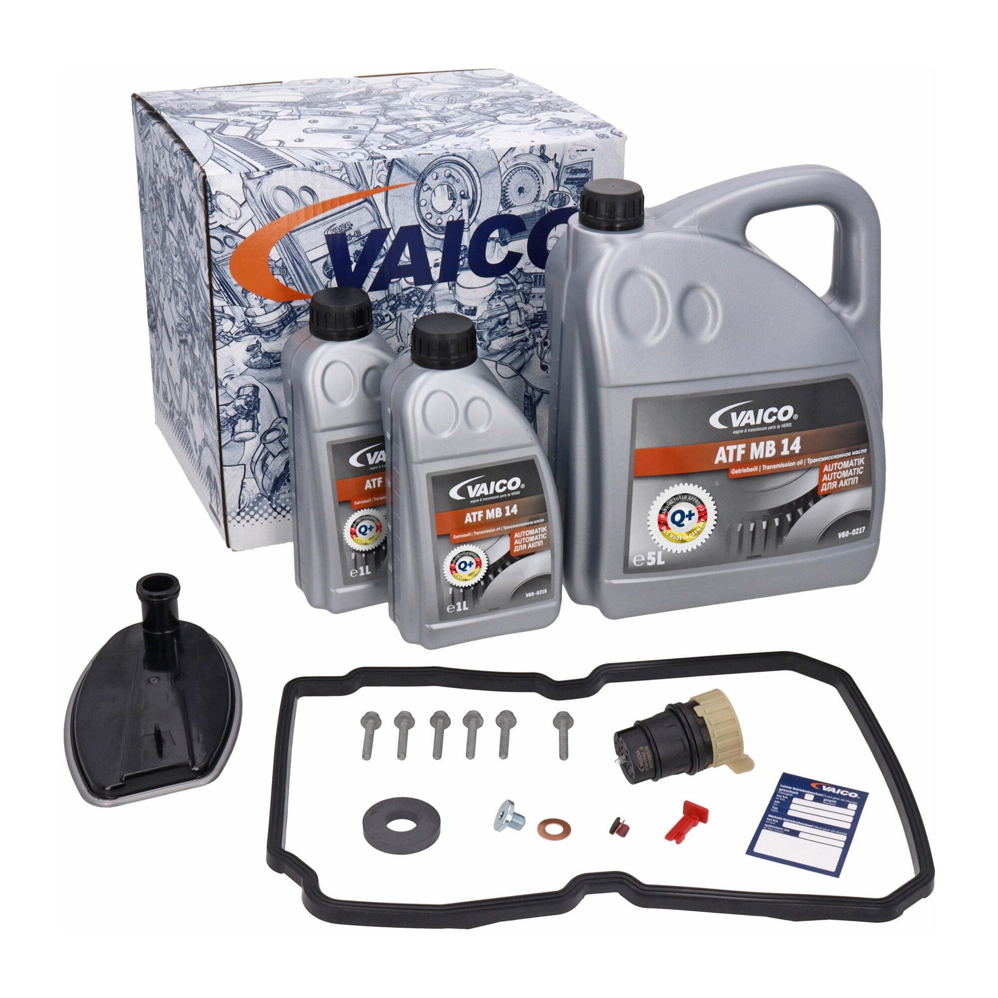 - ATF-Service Kit (722.6, W5A -580, -900, -380, -330 / 5-speed); Filter W/ Oil Pan Gasket, Plug Housing, Mfr Approved Transmission Oil (MB 236.14 - 7 ltr), Instl Hardware
