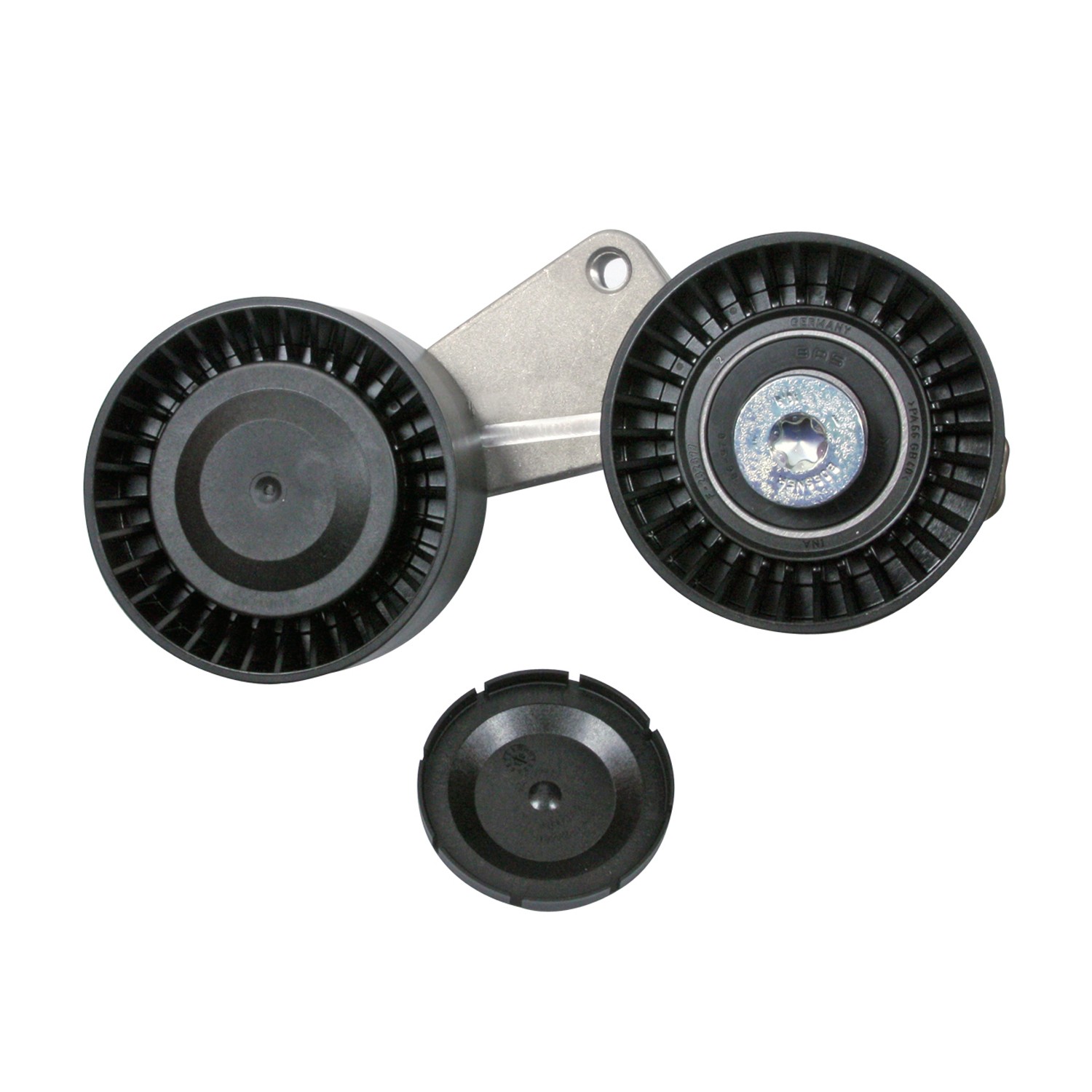 - Pre-assembled serpentine belt idler with 2 plastic pulleys and a dust cap.
