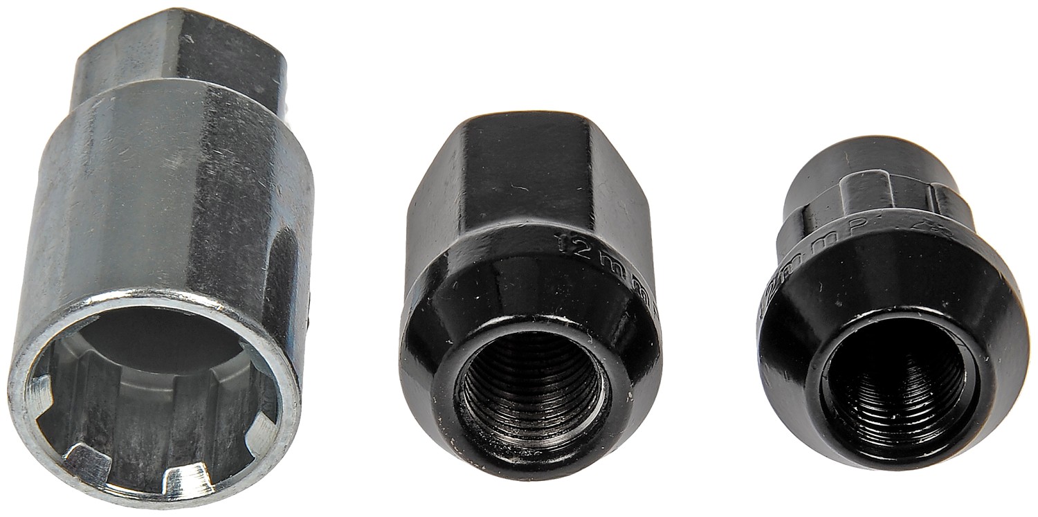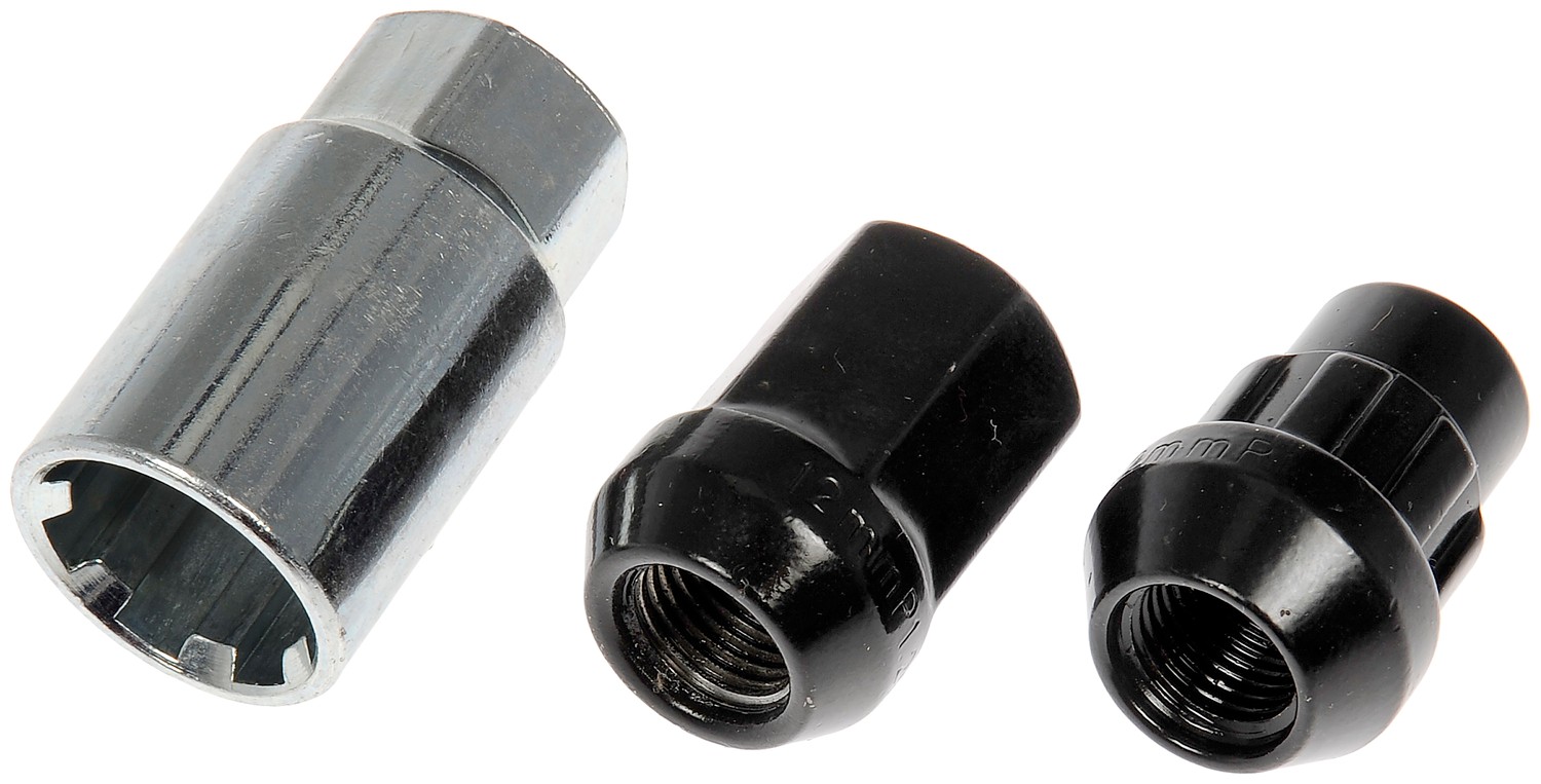 - This wheel lock set includes sixteen standard lug nuts, four locking lug nuts and a wheel lock key for security. Made of carbon steel with a black chrome finish, these wheel nuts have been tested to ensure strength, longevity and safety.