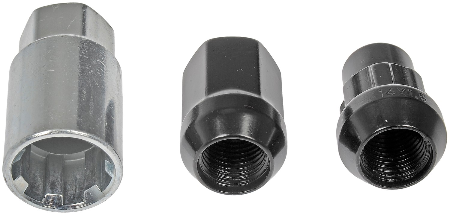 - This wheel lock set includes sixteen standard lug nuts, four locking lug nuts and a wheel lock key for security. Made of carbon steel with a black chrome finish, these wheel nuts have been tested to ensure strength, longevity and safety.